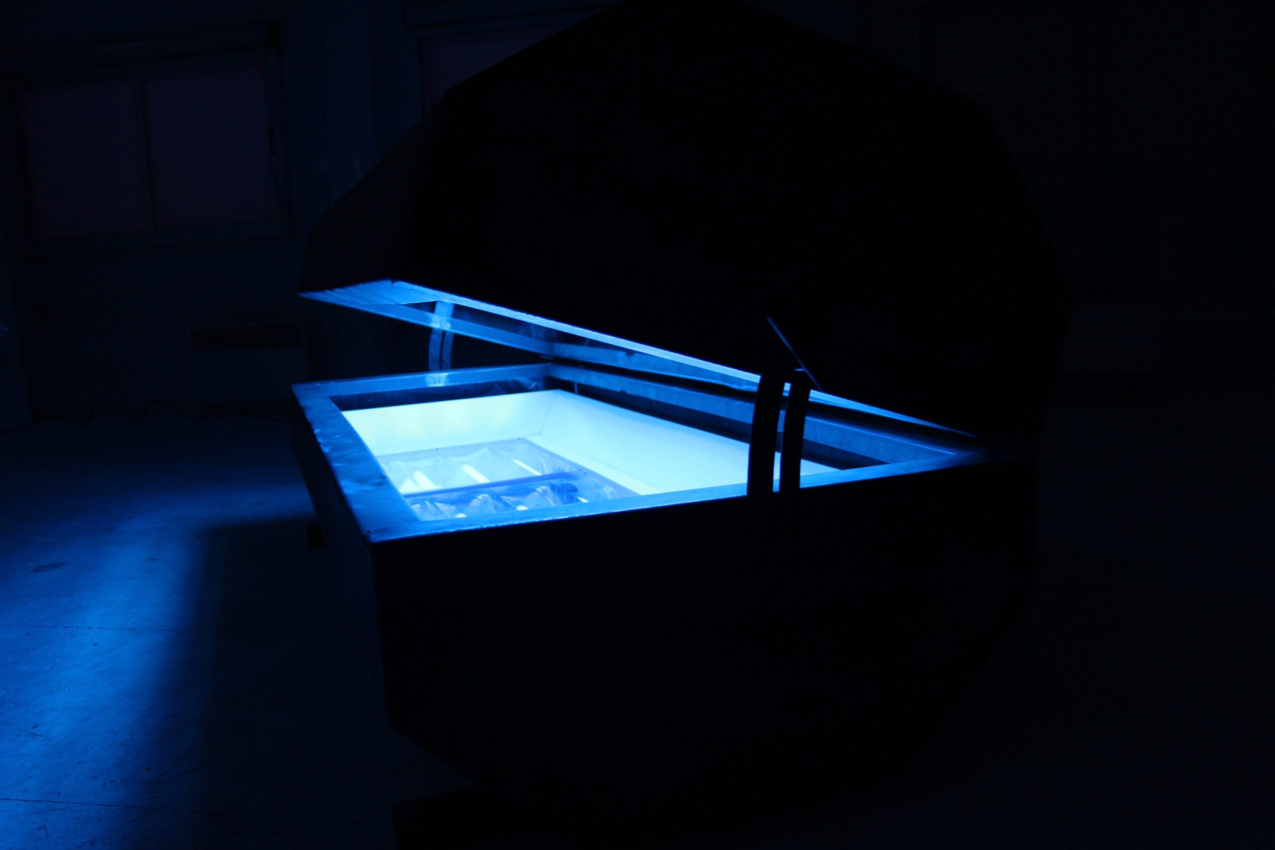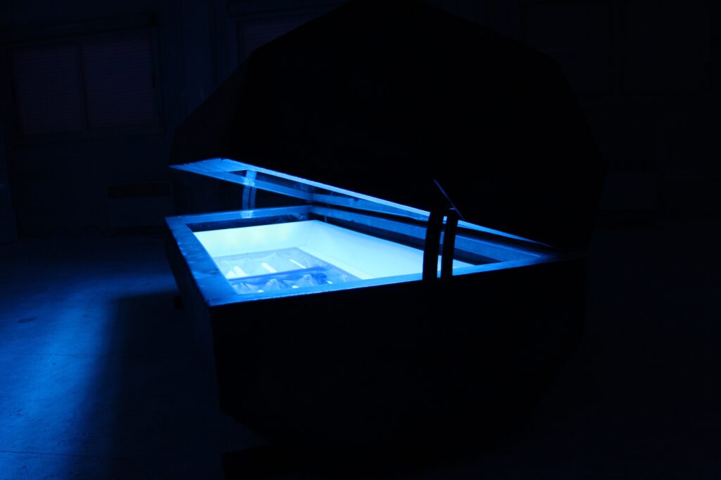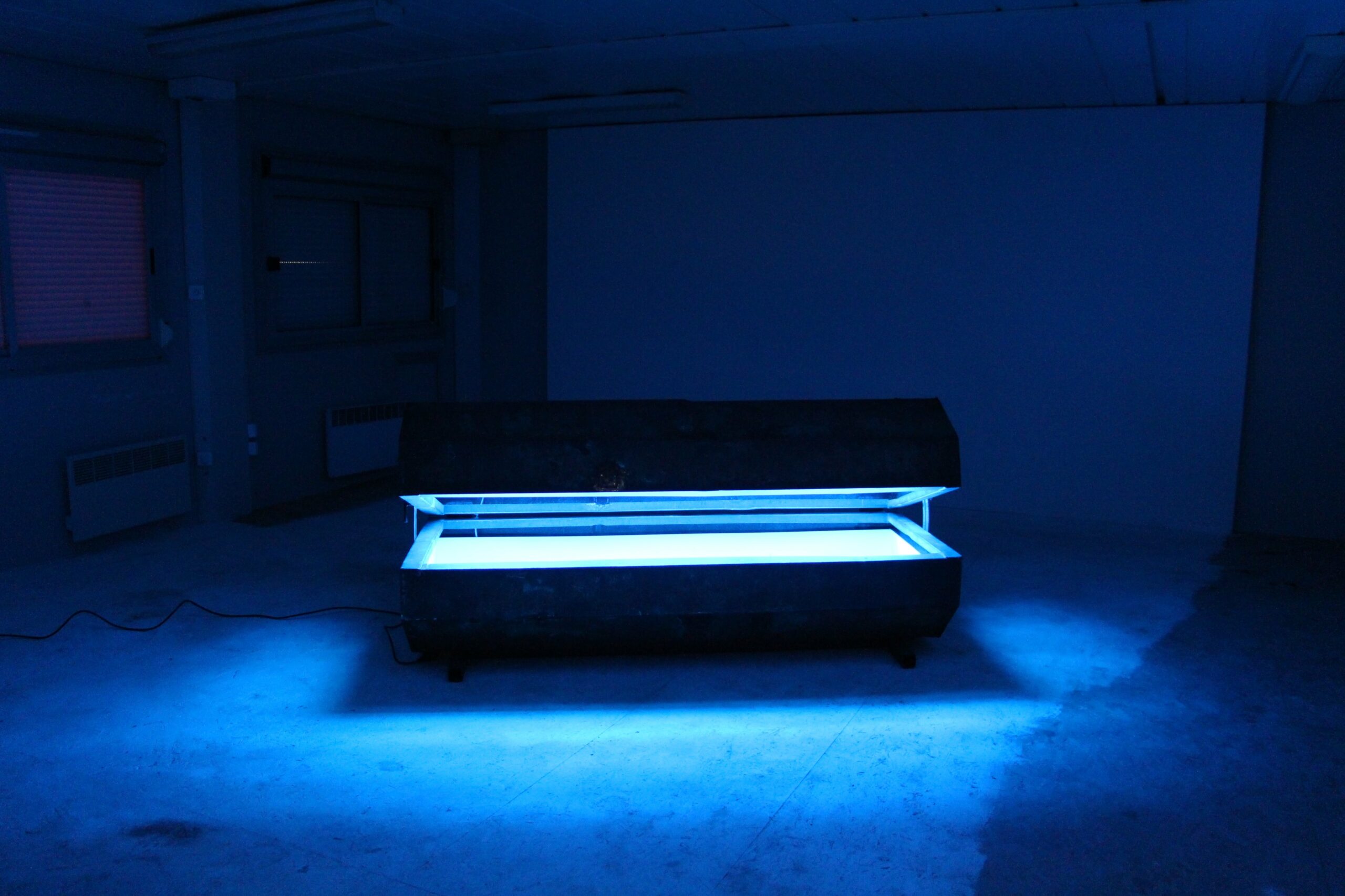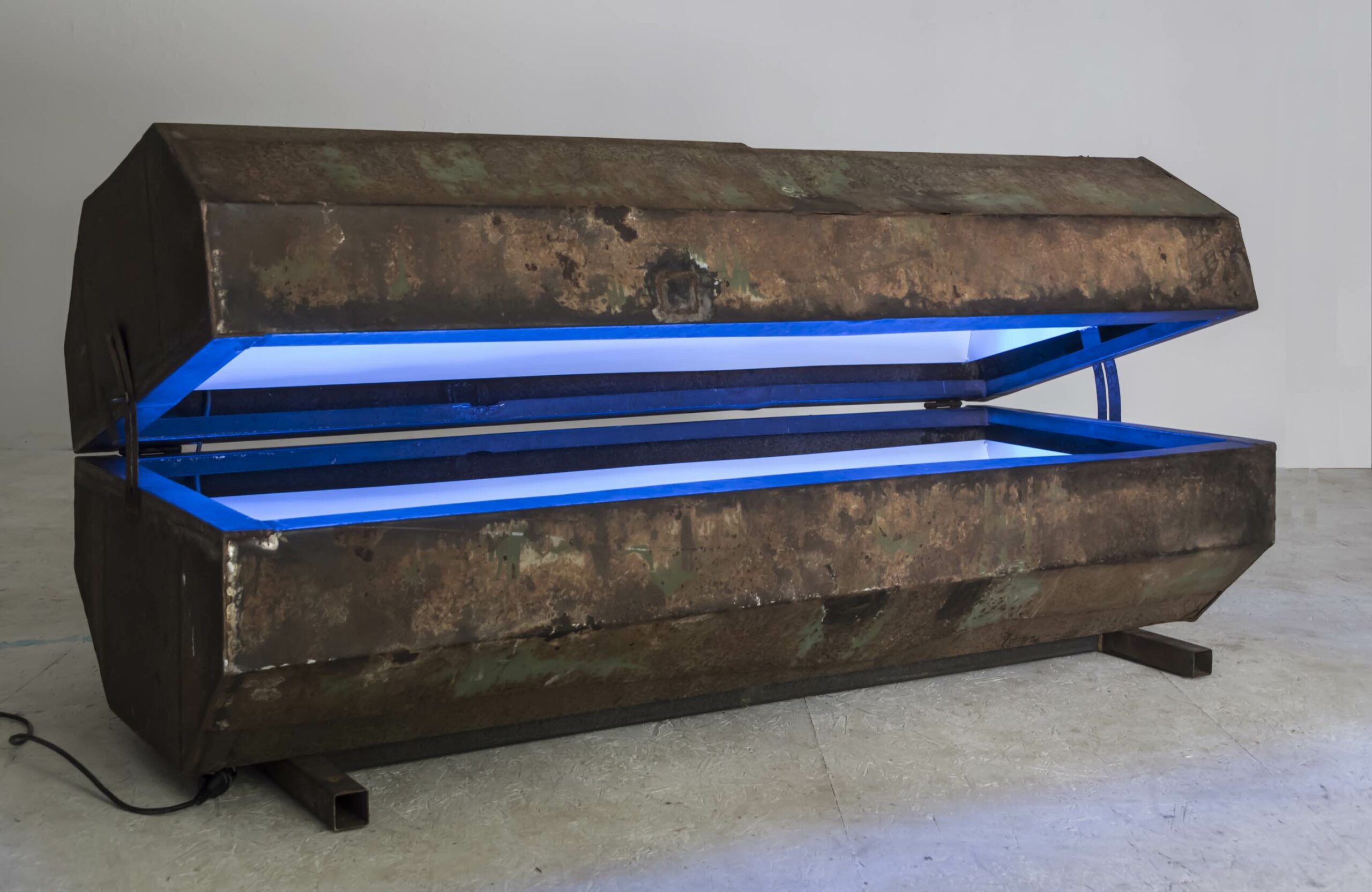 « Rusty Blue » est un objet hybride, il convoque plusieurs formes, celle d’une benne, d’un cercueil, d’une auge, d’un objet de science-fiction,… Son essence se résume certainement par son échelle : celle d’un porc et d’un homme en même temps.