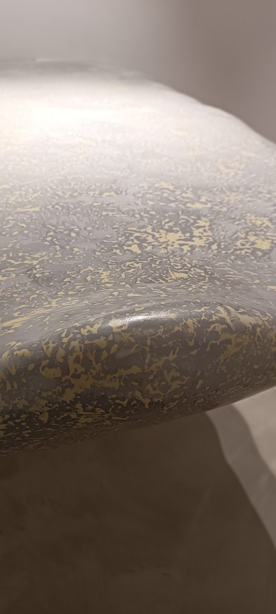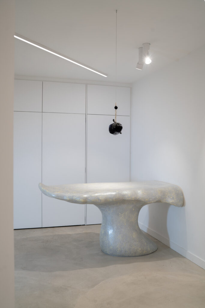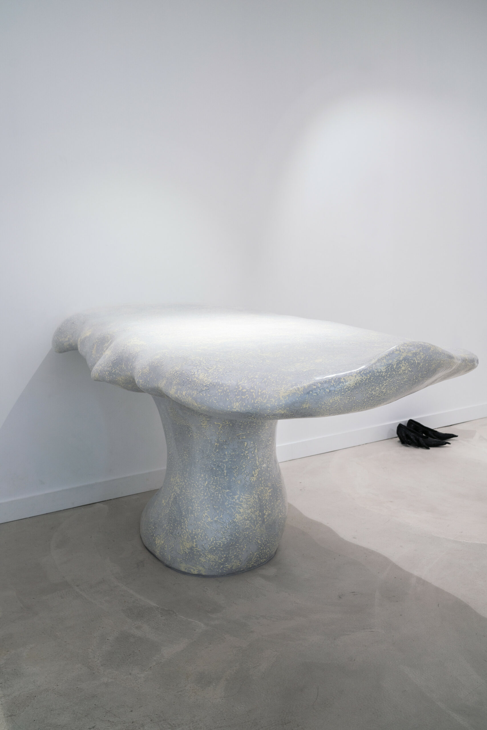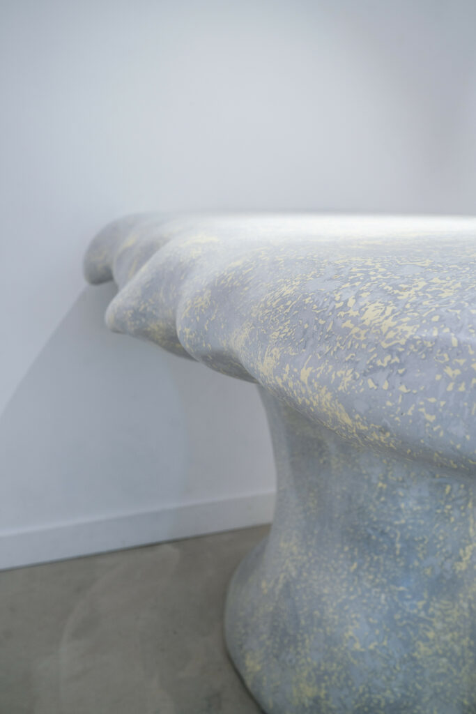 « Shroomhenge » est un support, une table à l’allure d’un monolithe qui pousse ici et là. Ancrée au sol, cette etrange pierre en résine évoque le marbre. Elle semble pourtant être en mouvement, pas tout à fait organique, ni vraiment minéral, elle oscille entre ces différents états à la frontière du naturel et du fantastique.