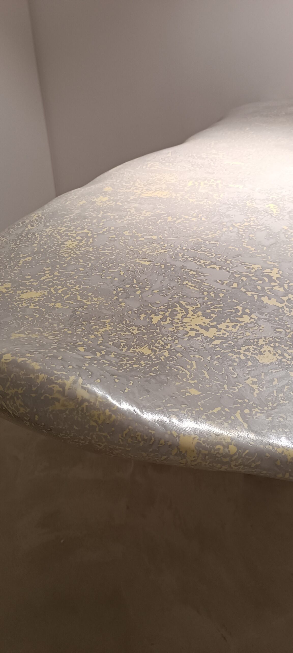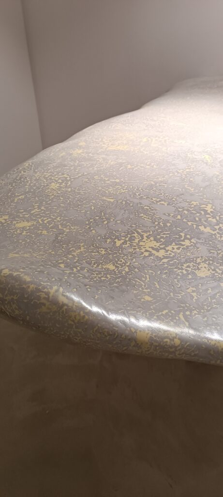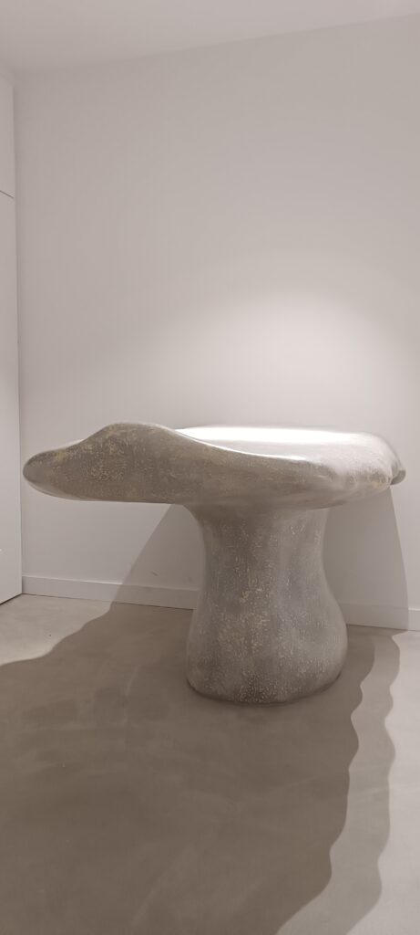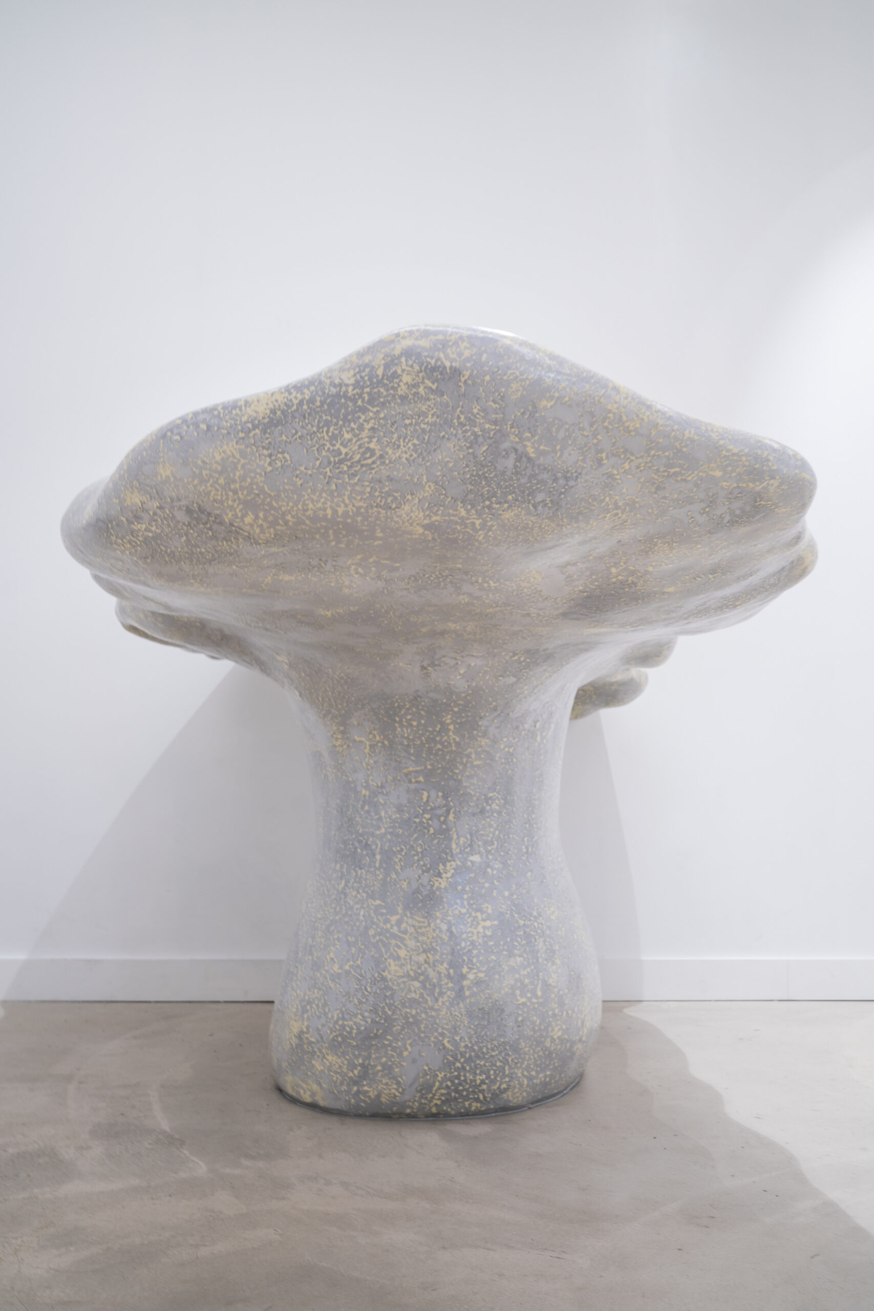 La résine a été travaillé avec des matériaux tels que de la poudre de marbre, de la nacre et du graphite, rappelant la diversité et la complexité des formes que l’on trouve dans la nature. Finalement, que ce soit dans les parcs d’attraction, les jardins d’enfants ou dans la culture populaire, les champignons ont souvent été transfigurés comme mobilier.