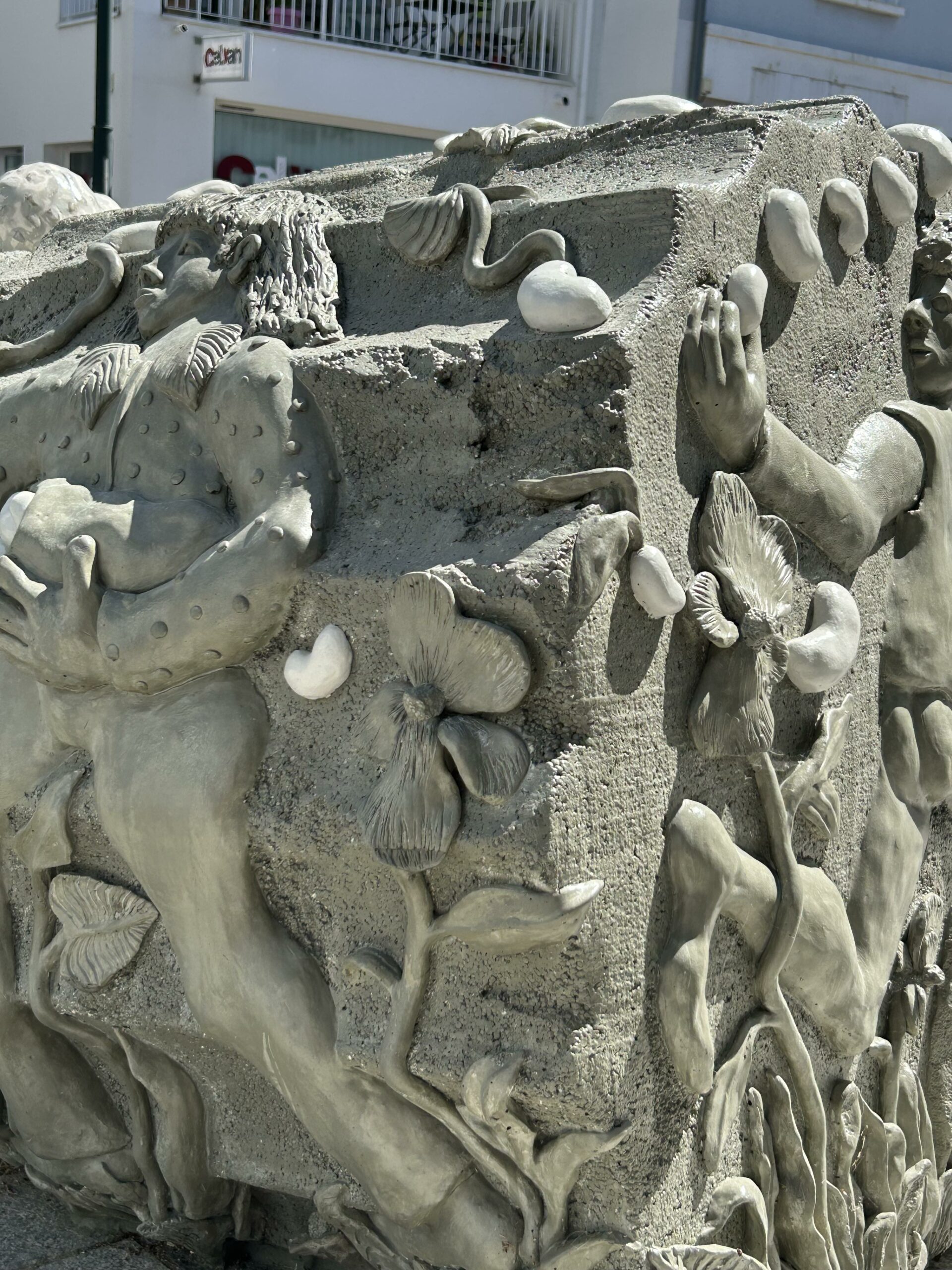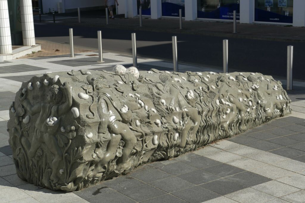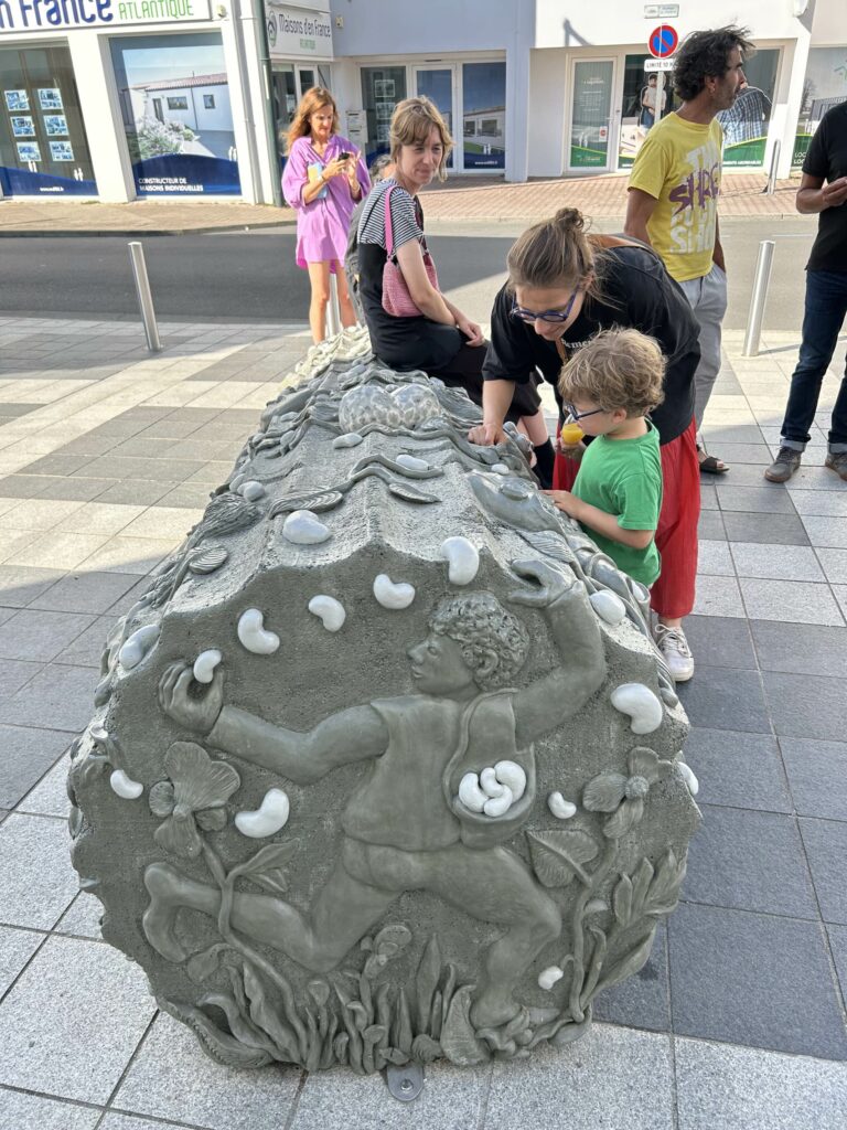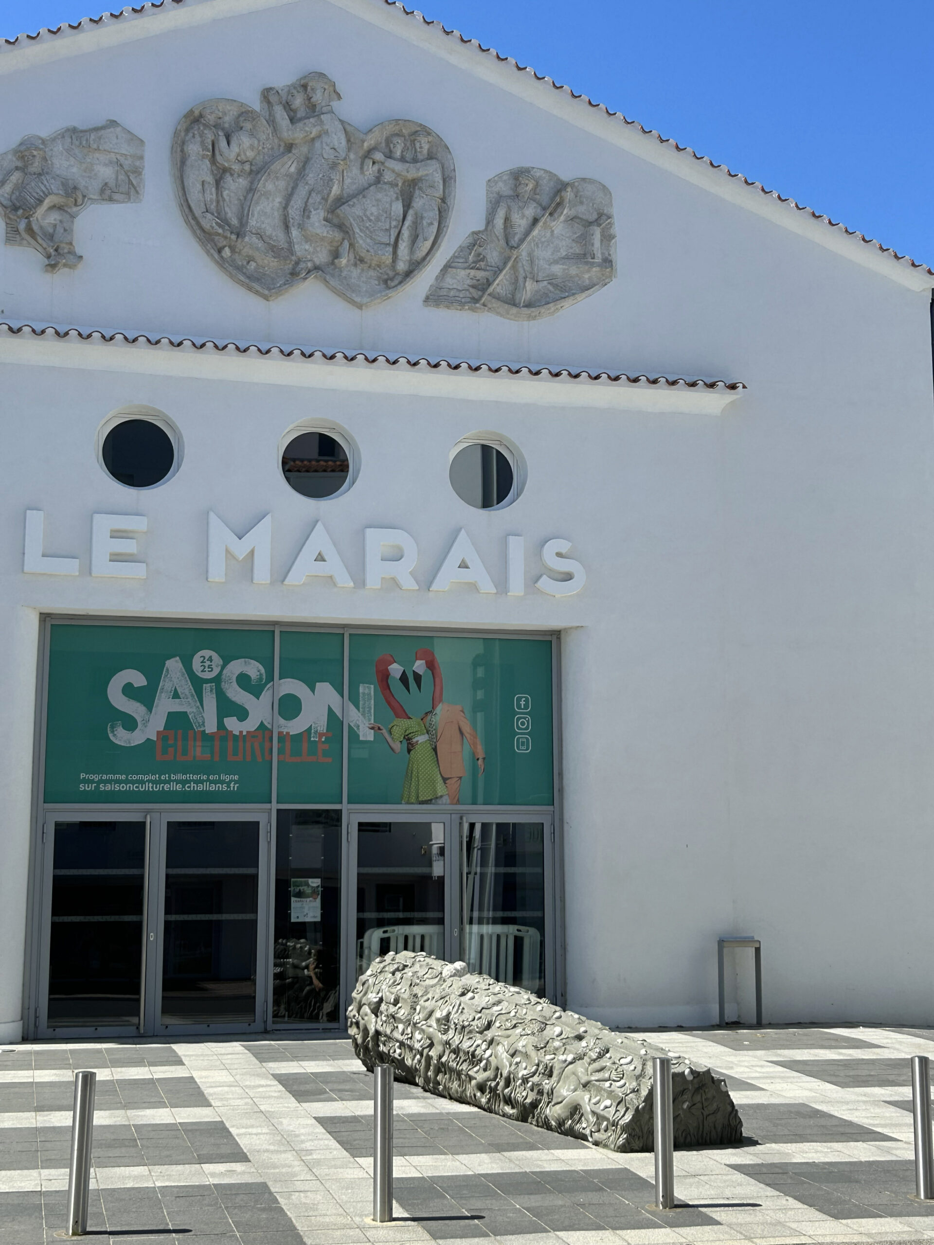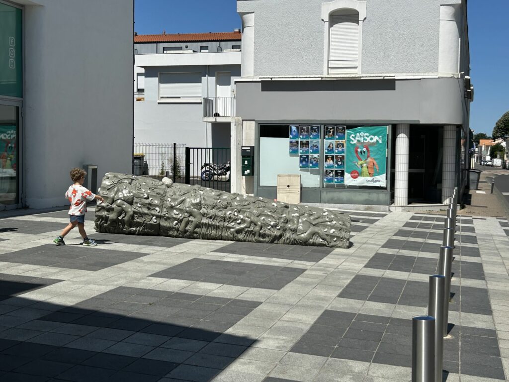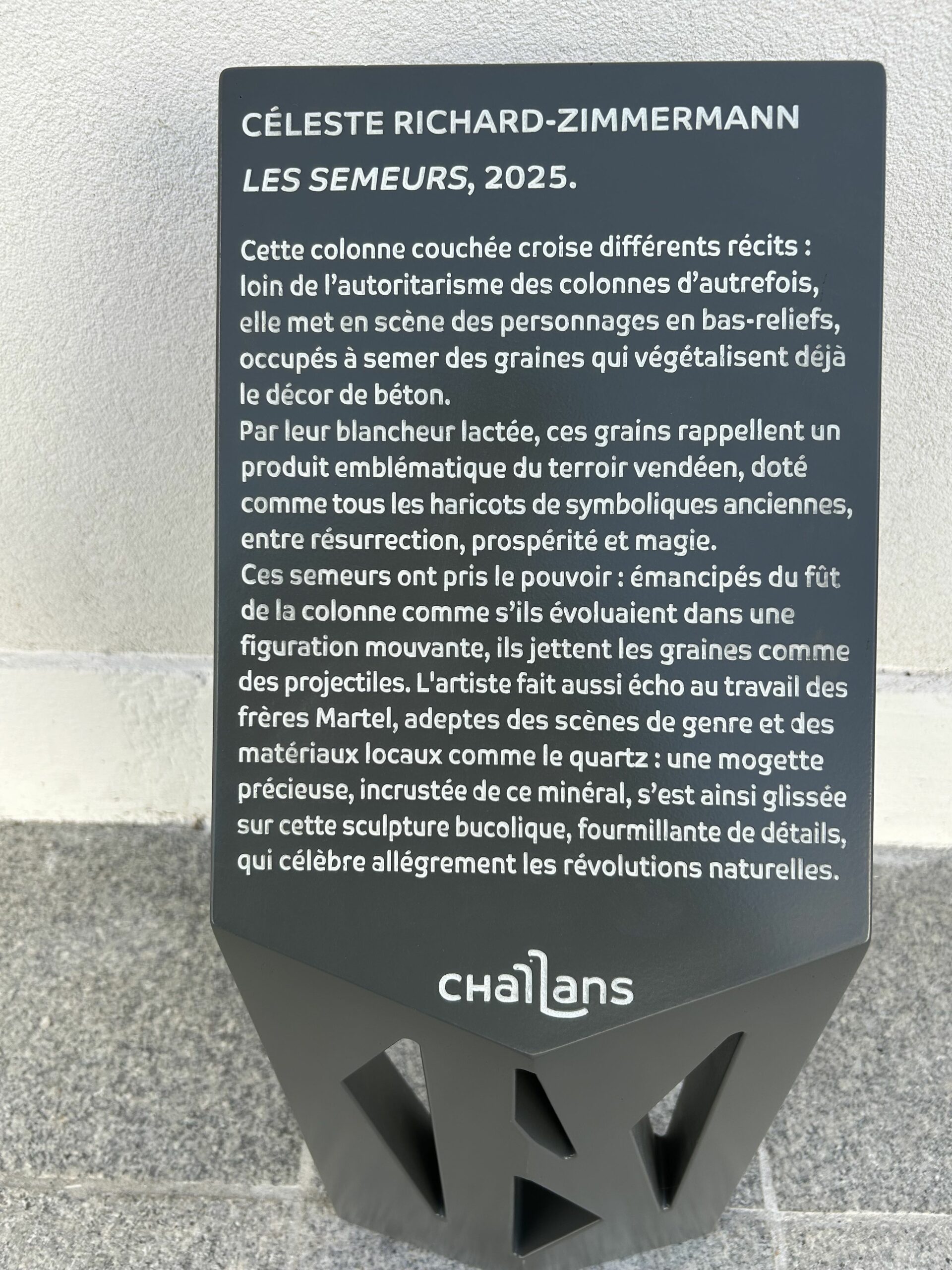 Sur le parvis du théâtre Le Marais, des tronçons au sol rappellent un vestige des temps passés. Une colonne de béton en plusieurs fûts semble avoir chuté et devient par ce fait un banc. Le long de la colonne, des personnages en bas-relief sculptés comme par rajout s’affairent sur cette carcasse cylindrique et sèment des graines emblématiques du territoire vendéen.