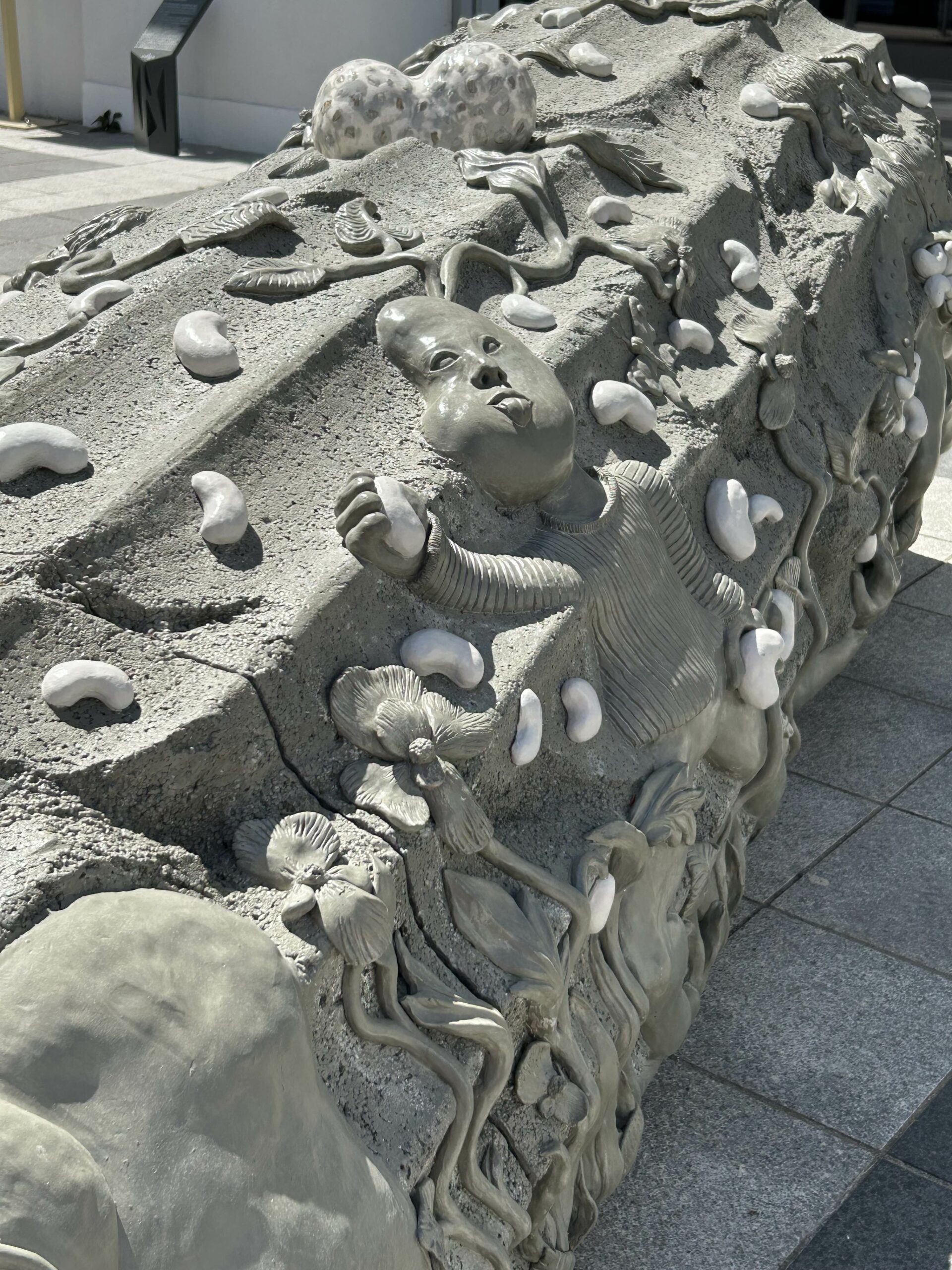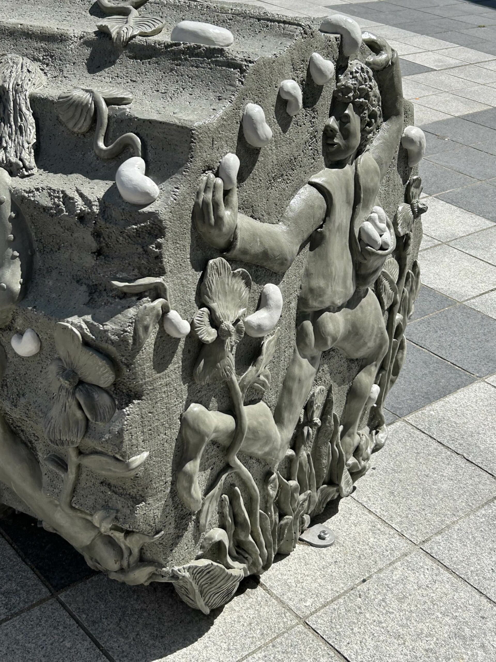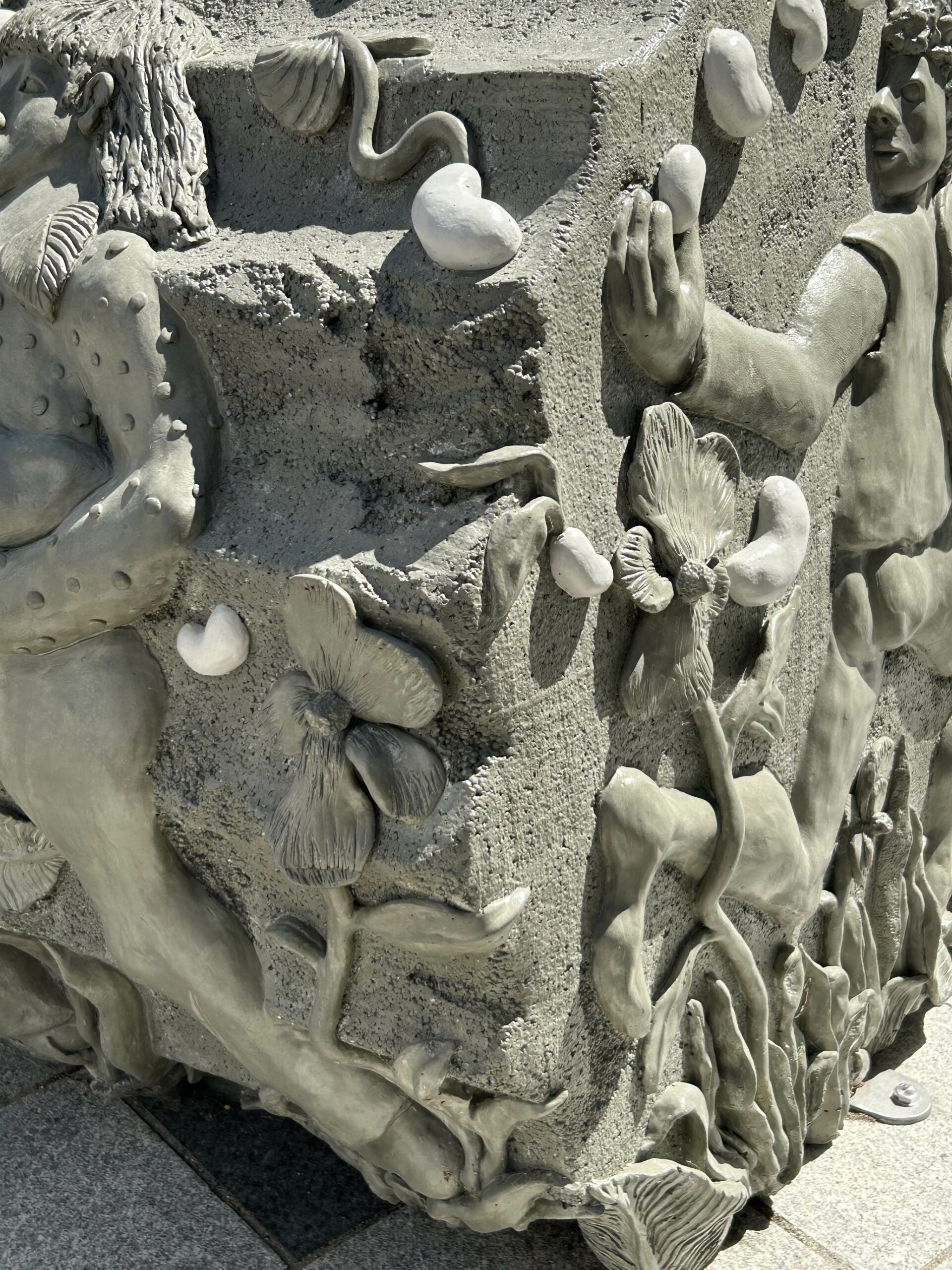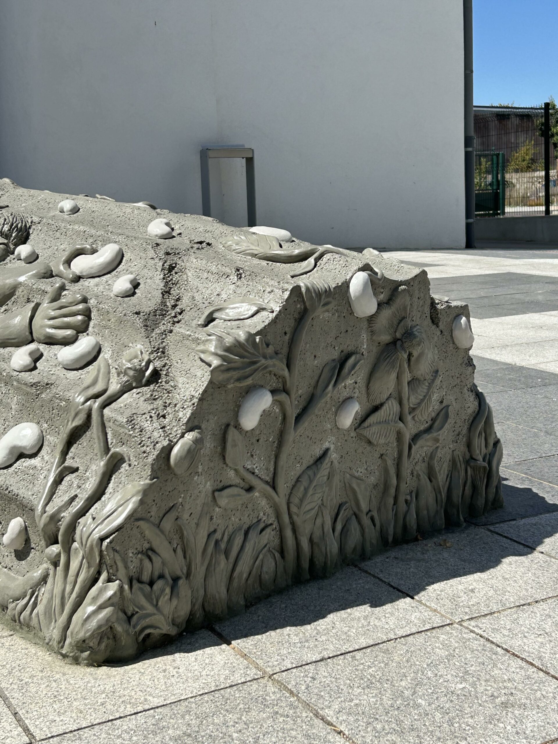 Sur le parvis du théâtre Le Marais, des tronçons au sol rappellent un vestige des temps passés. Une colonne de béton en plusieurs fûts semble avoir chuté et devient par ce fait un banc. Le long de la colonne, des personnages en bas-relief sculptés comme par rajout s’affairent sur cette carcasse cylindrique et sèment des graines emblématiques du territoire vendéen.