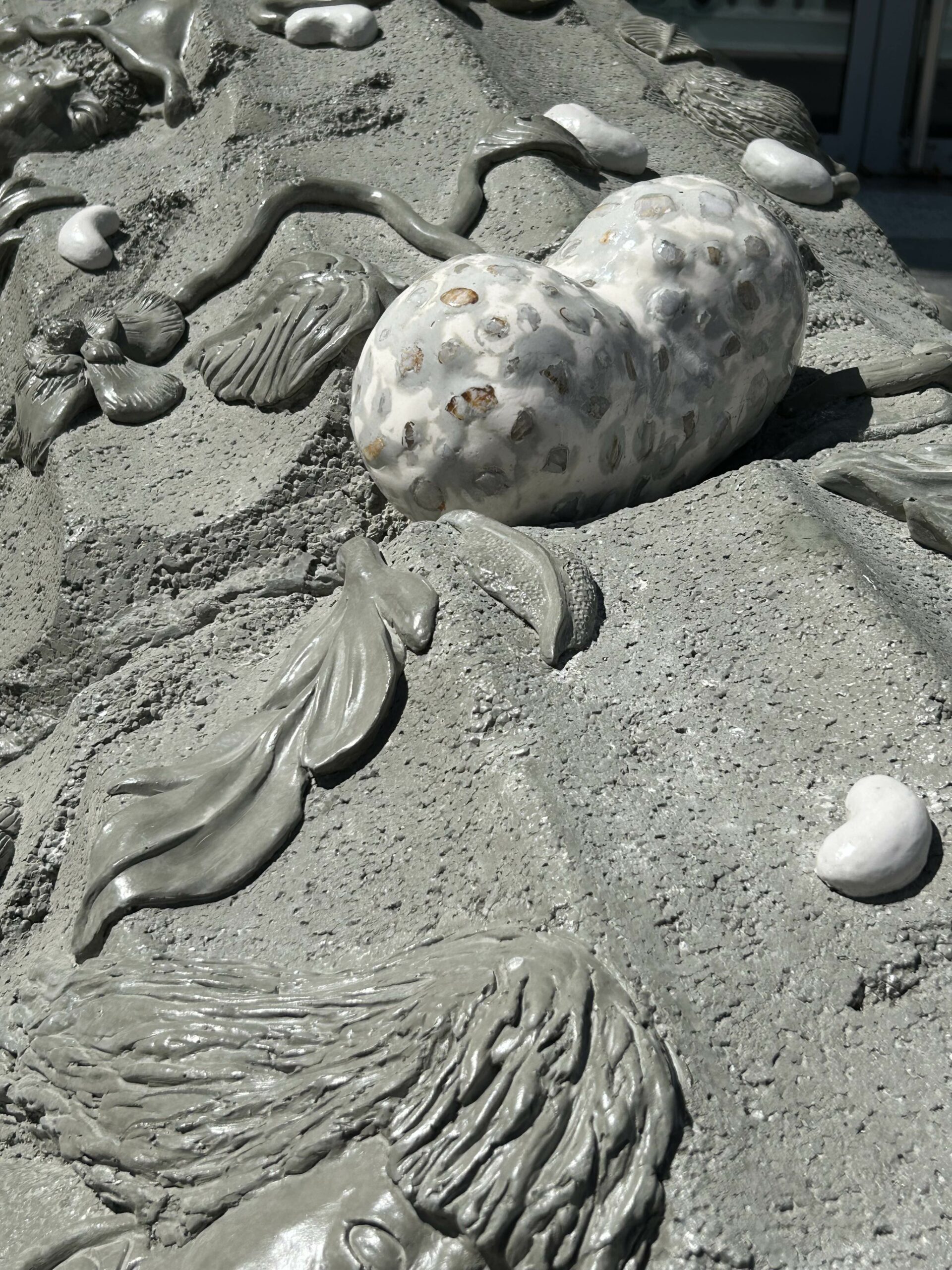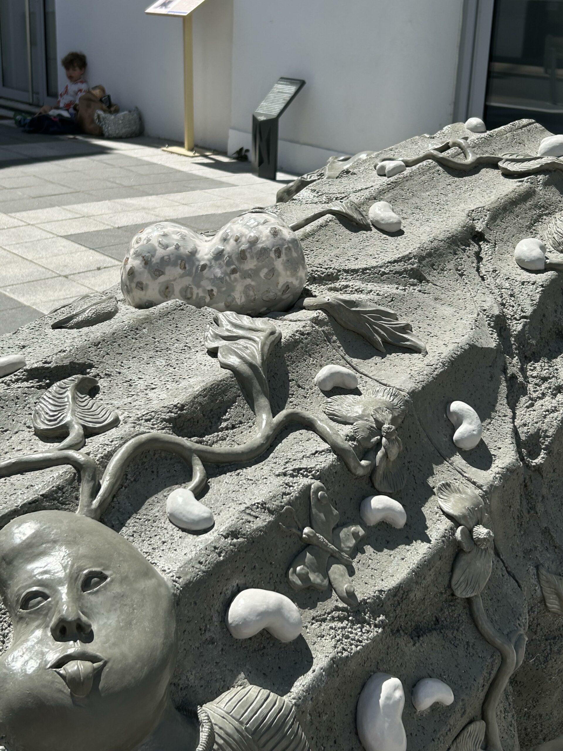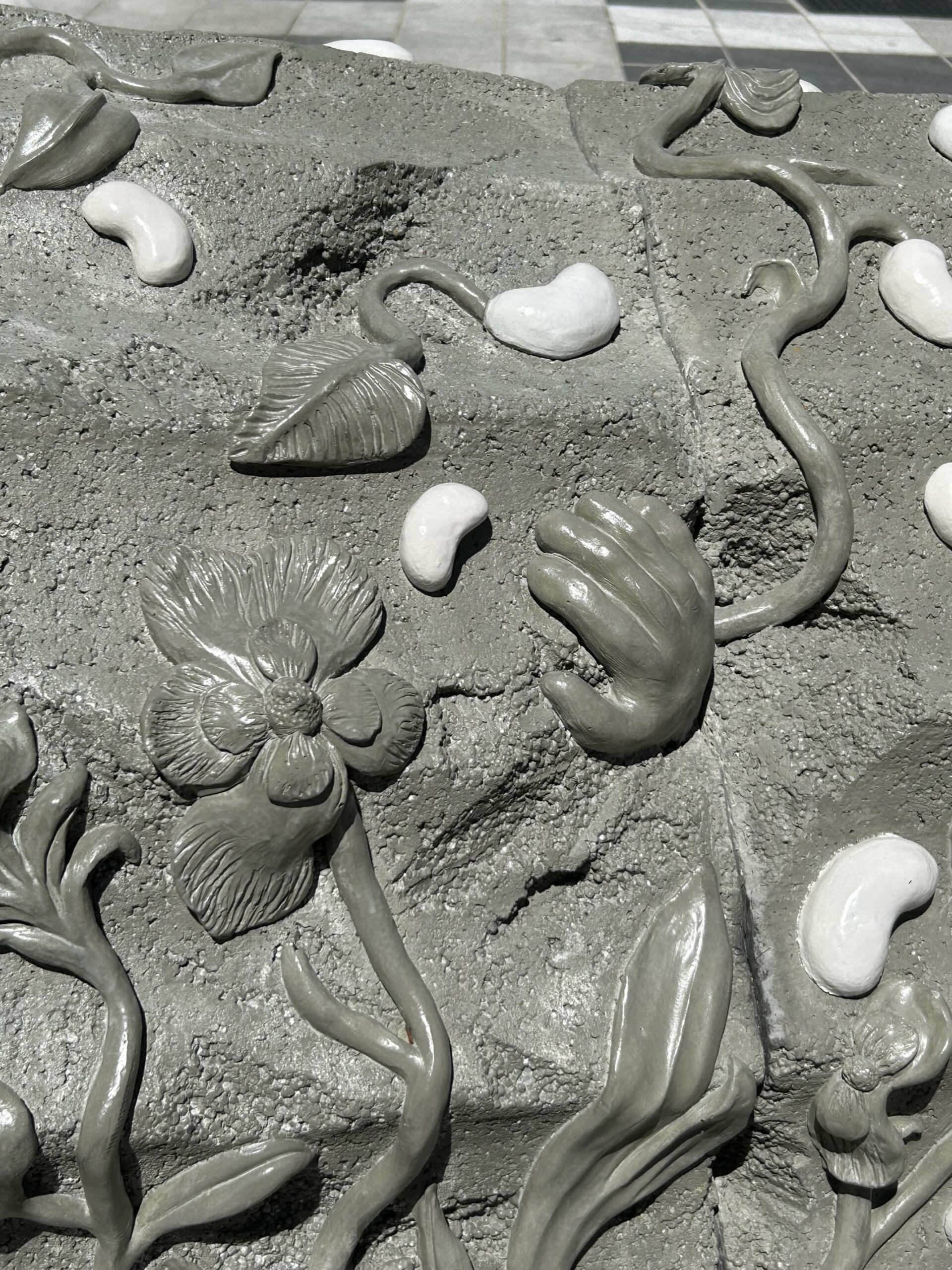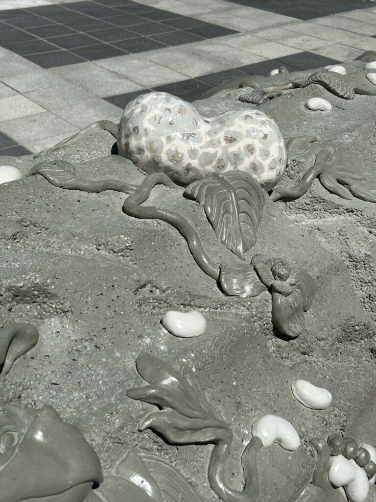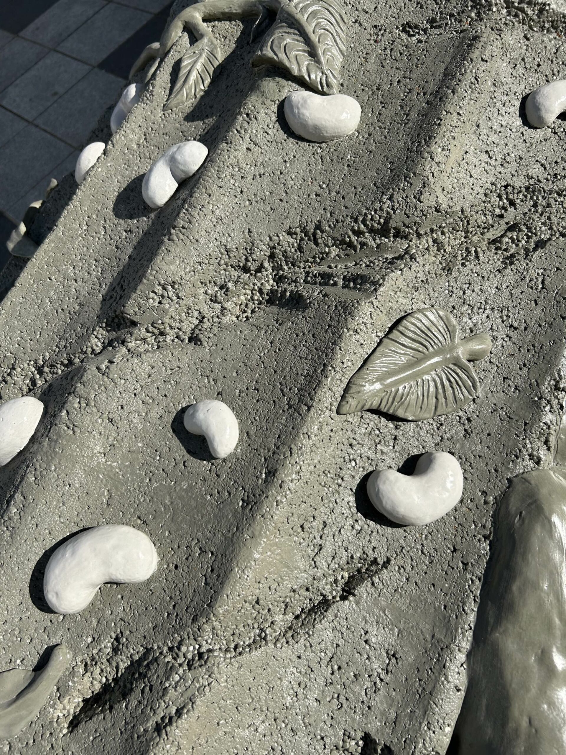 Sur le parvis du théâtre Le Marais, des tronçons au sol rappellent un vestige des temps passés. Une colonne de béton en plusieurs fûts semble avoir chuté et devient par ce fait un banc. Le long de la colonne, des personnages en bas-relief sculptés comme par rajout s’affairent sur cette carcasse cylindrique et sèment des graines emblématiques du territoire vendéen.