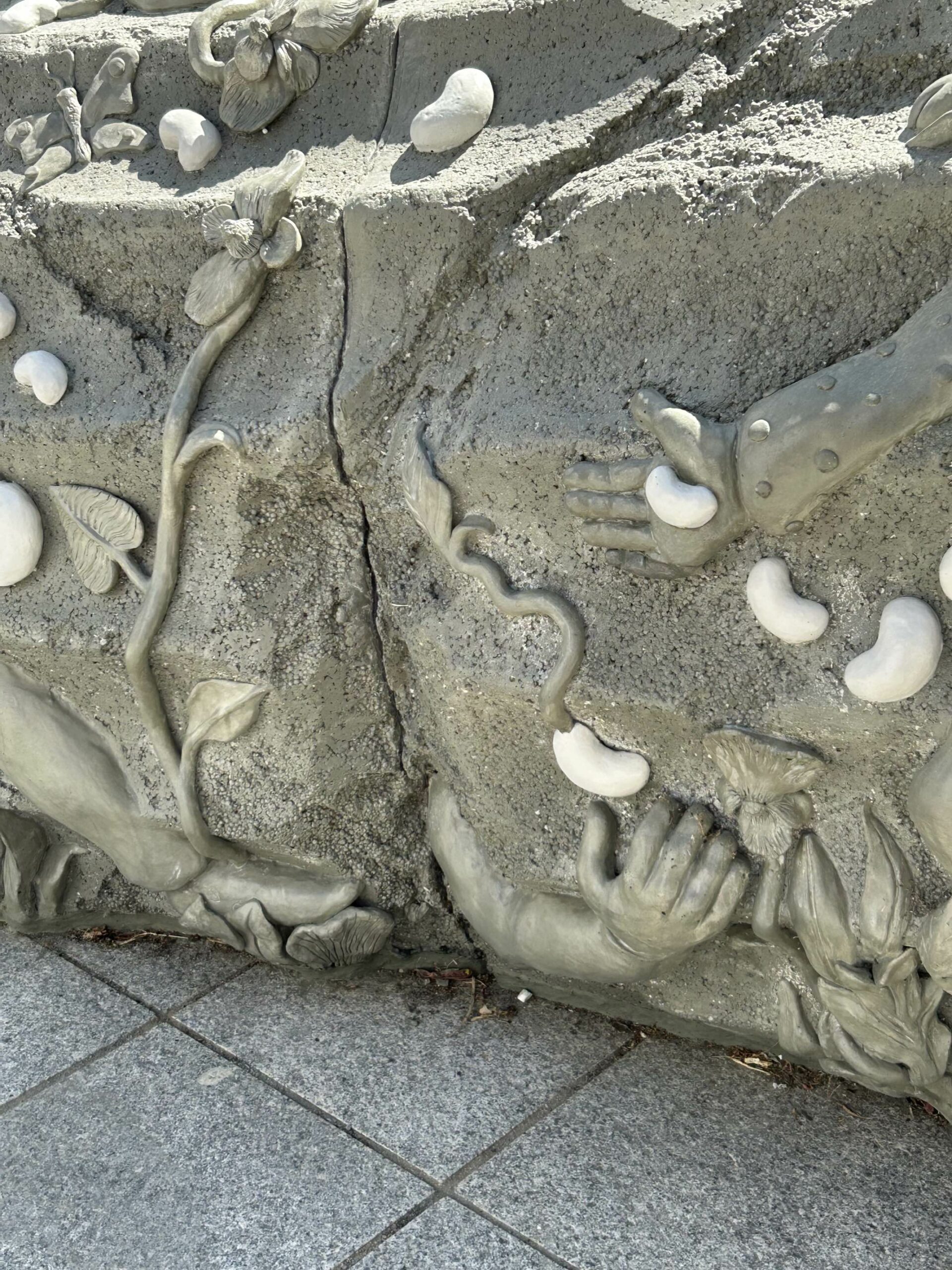 Des haricots, lancés comme des projectiles s’emparent déjà de la ruine ; et dans son creux, la métamorphose s’opère : une mogette précieuse incrustée de quartz, en pleine croissance, pousse.