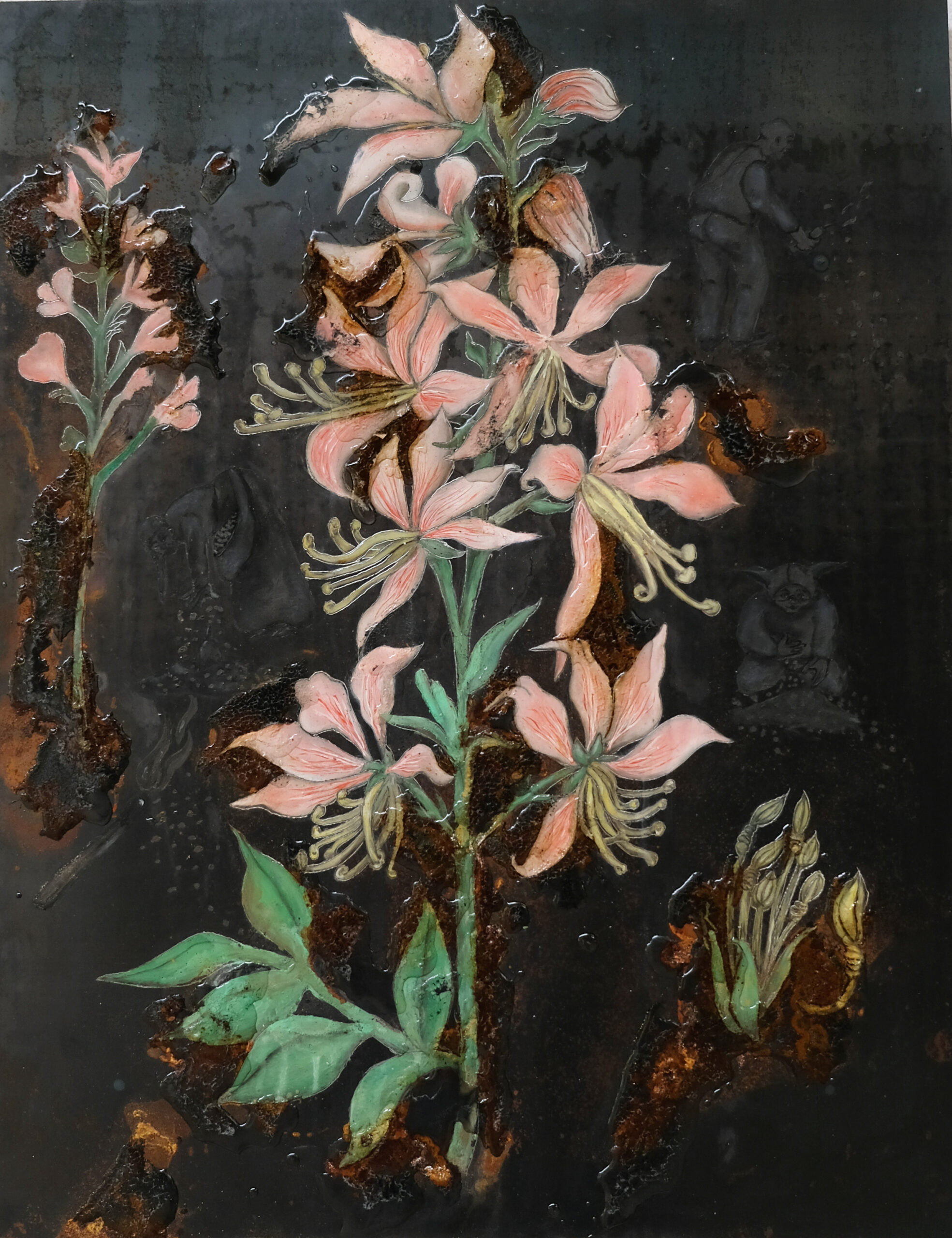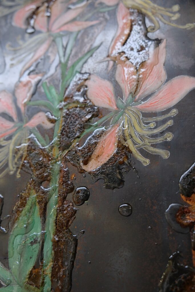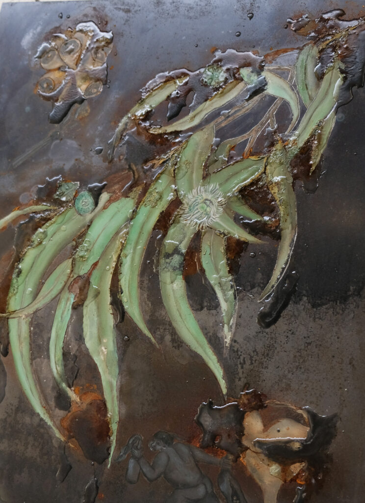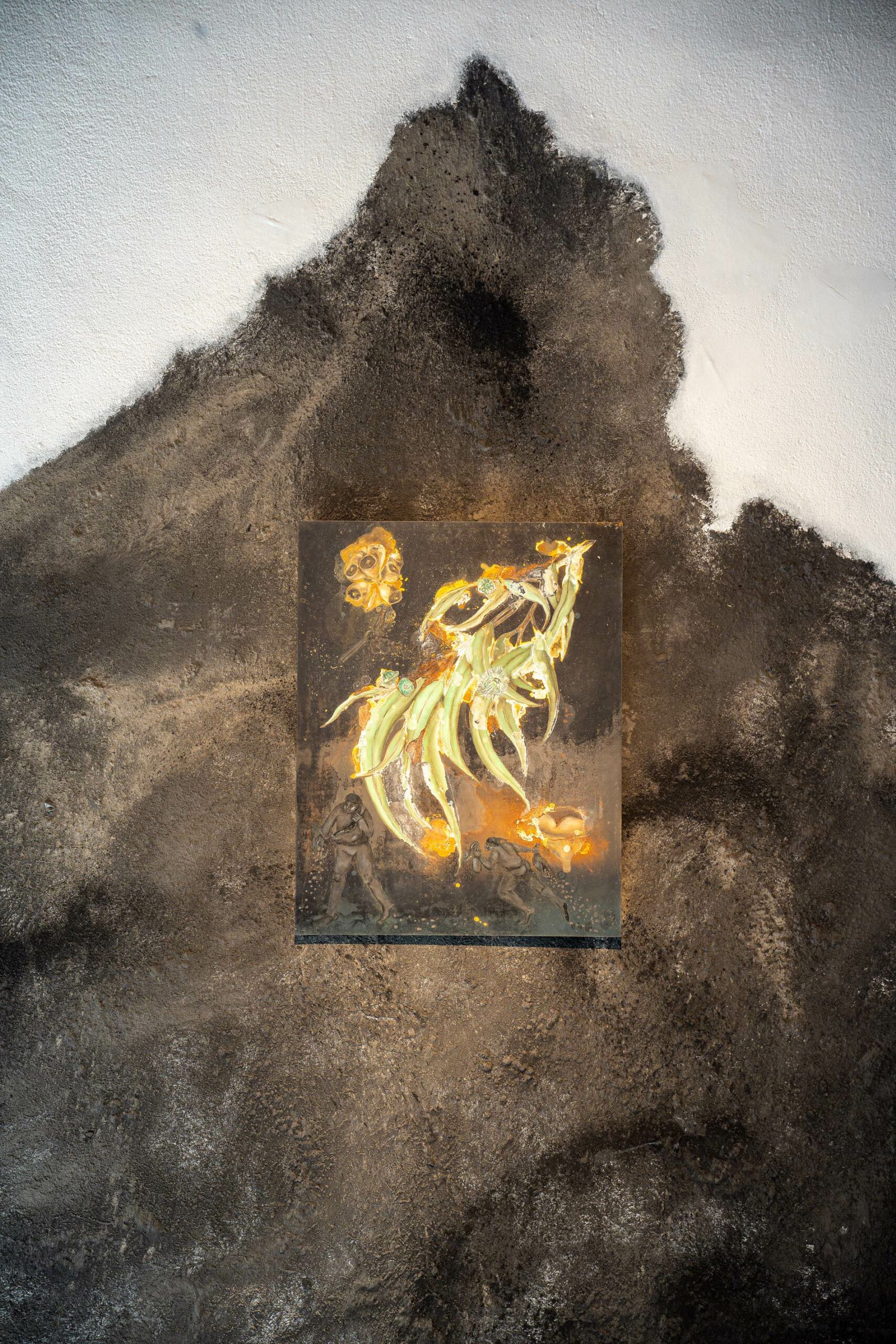 « En bonne vandale, l’artiste attaque ses propres représentations à l’acide : comme la mousse polyuréthane, l’acide réagit imprévisiblement, il brûle, révèle et cache en même temps, avec des pouvoirs de calcination et d’oxydation, des effets de salpêtre ou de champignon. »