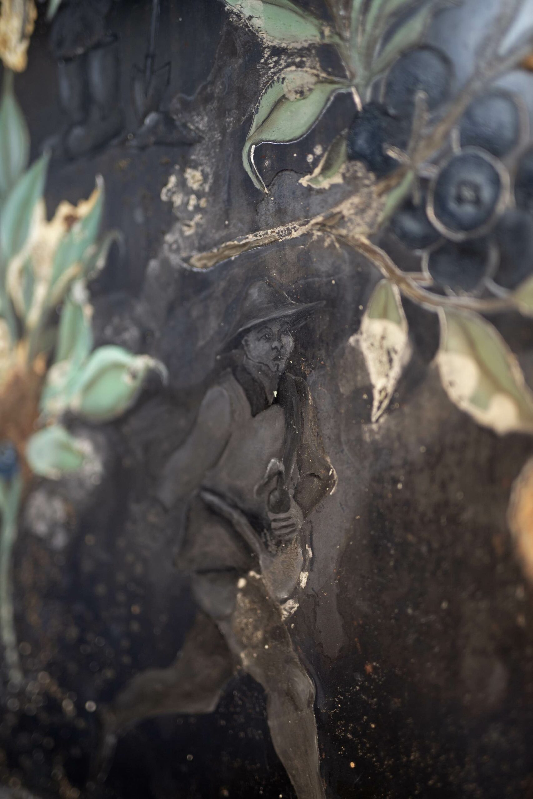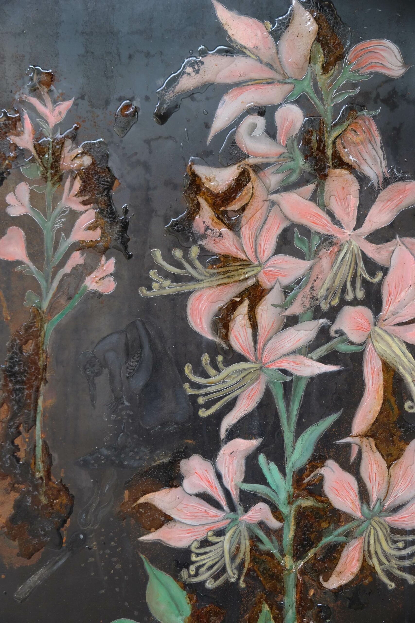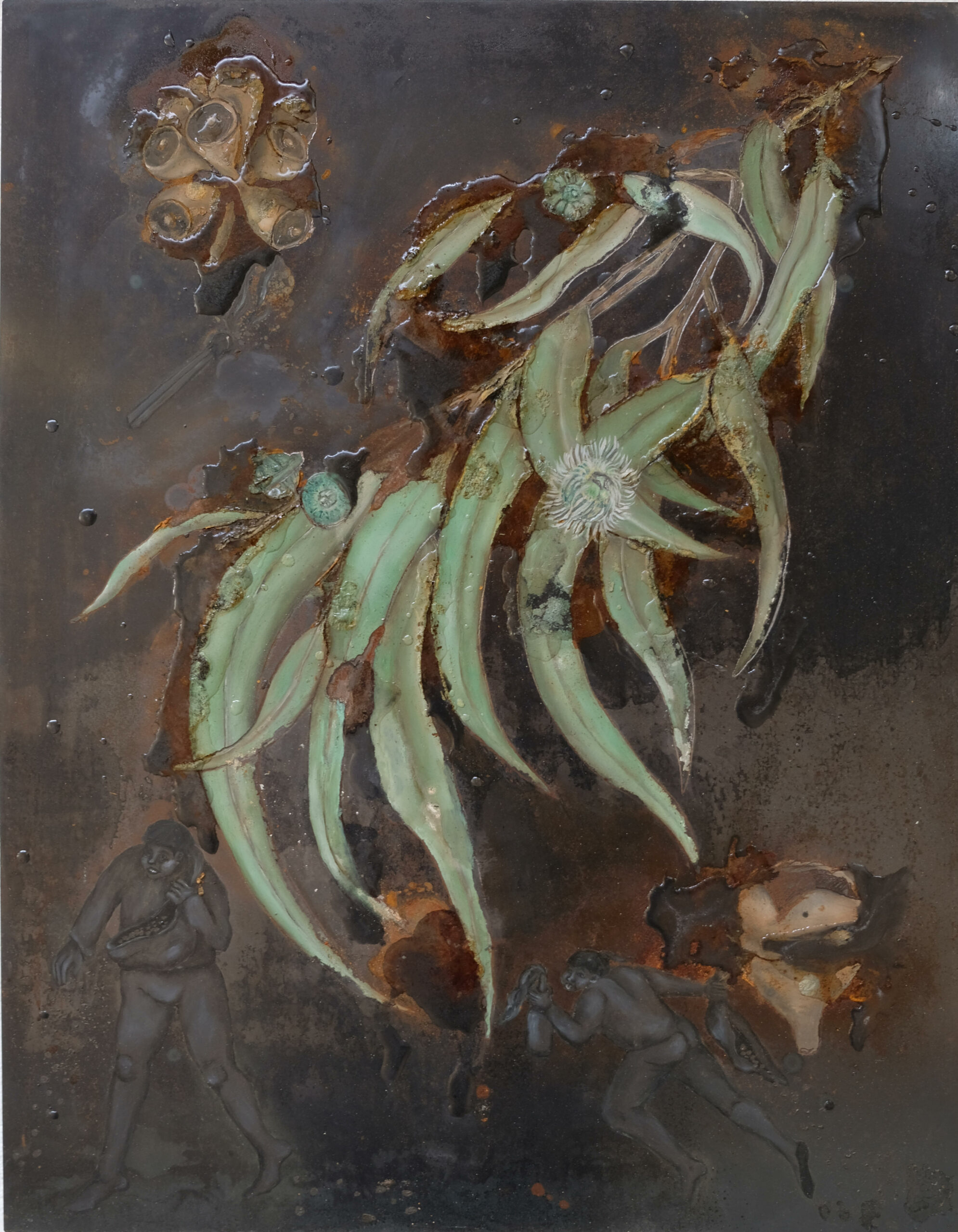 « En bonne vandale, l’artiste attaque ses propres représentations à l’acide : comme la mousse polyuréthane, l’acide réagit imprévisiblement, il brûle, révèle et cache en même temps, avec des pouvoirs de calcination et d’oxydation, des effets de salpêtre ou de champignon. »