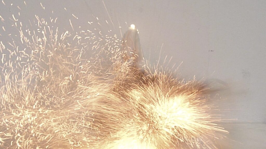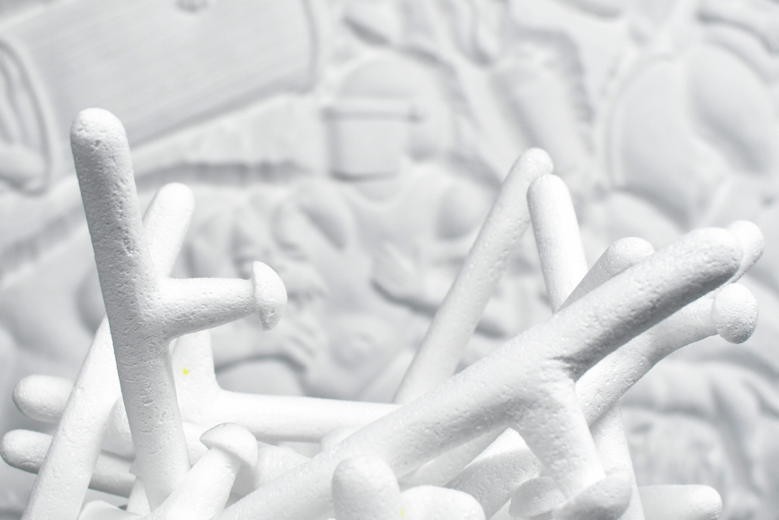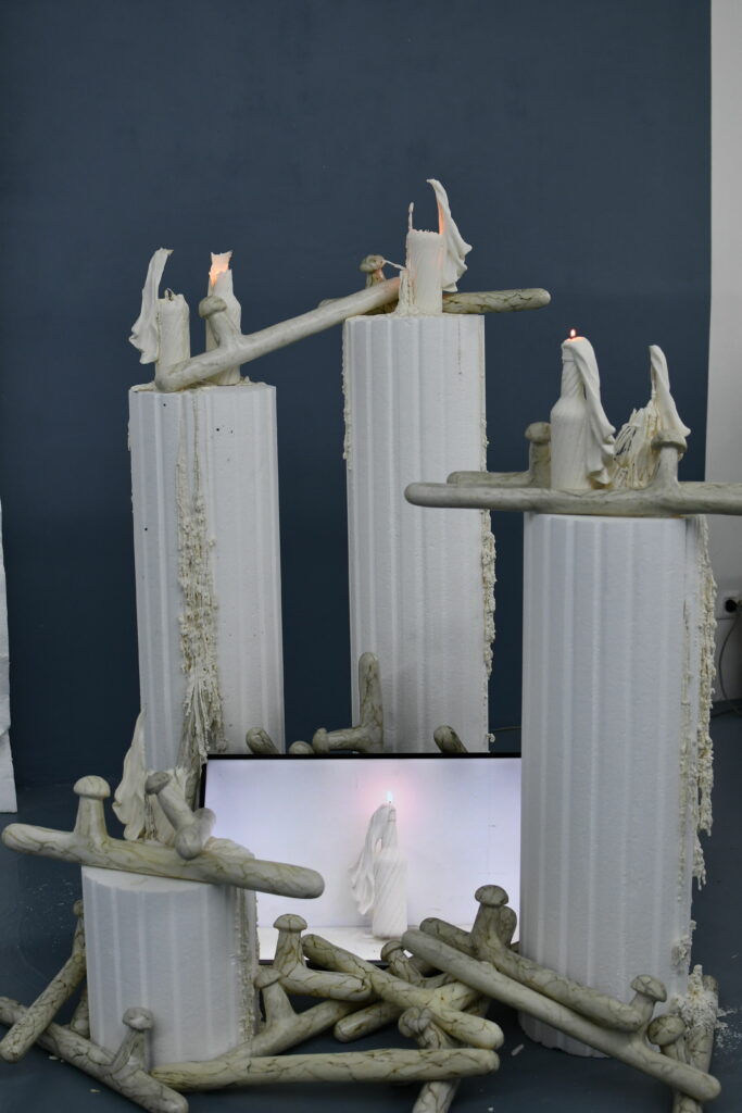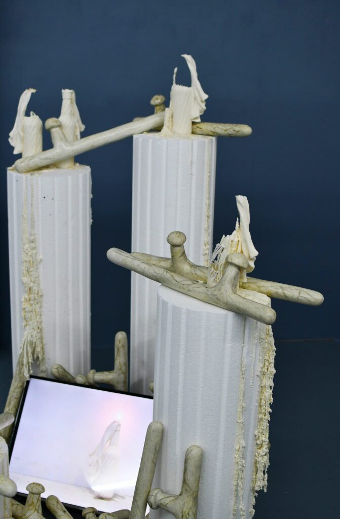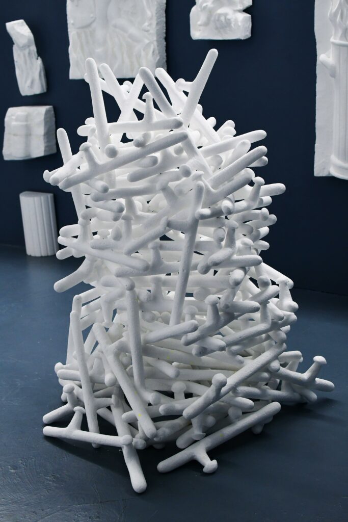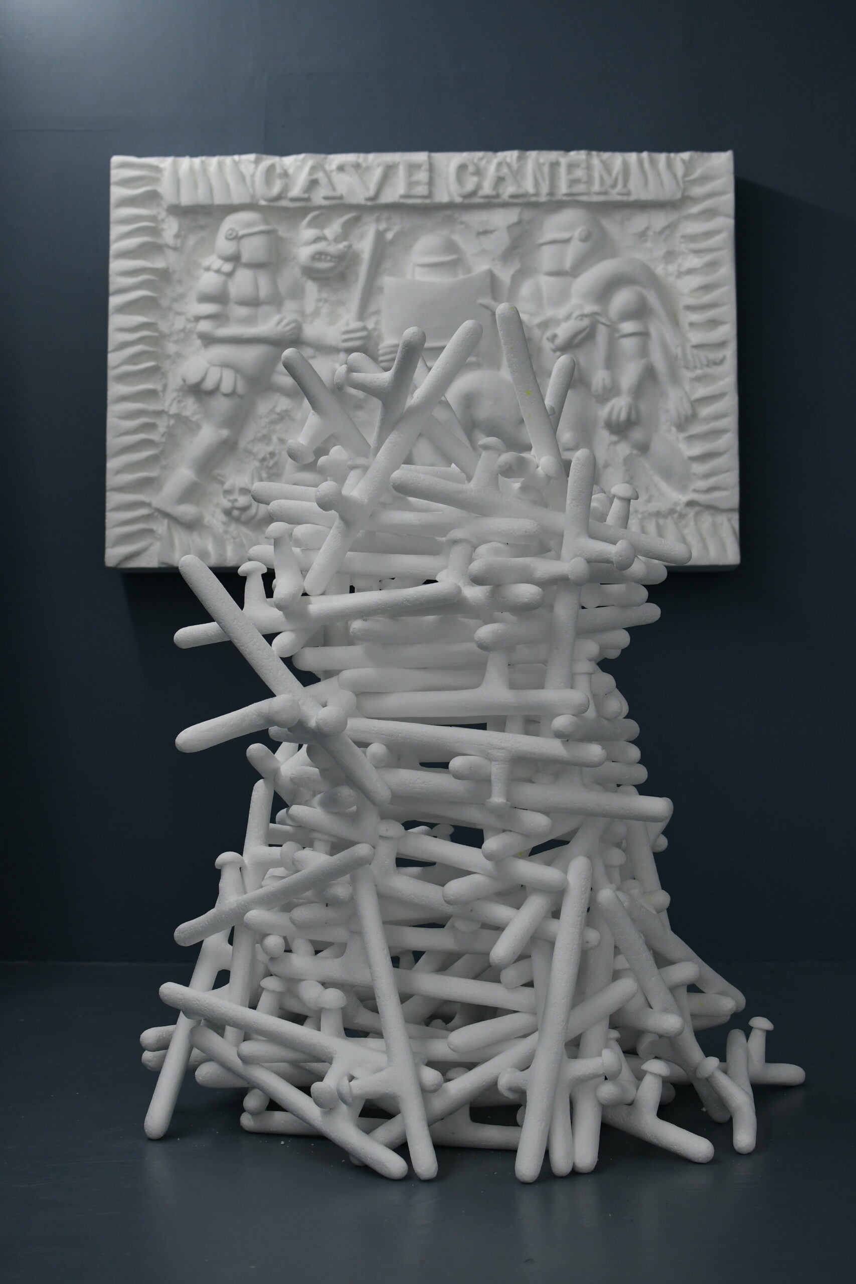 En polystyrène et pour certaines peintes et résinées afin de leur donner une apparence marbrée, elles sont disposées de manière à évoquer un bûcher dont les braises couvent dans l’attente d’un embrasement déjà entamé sur les bas-reliefs.