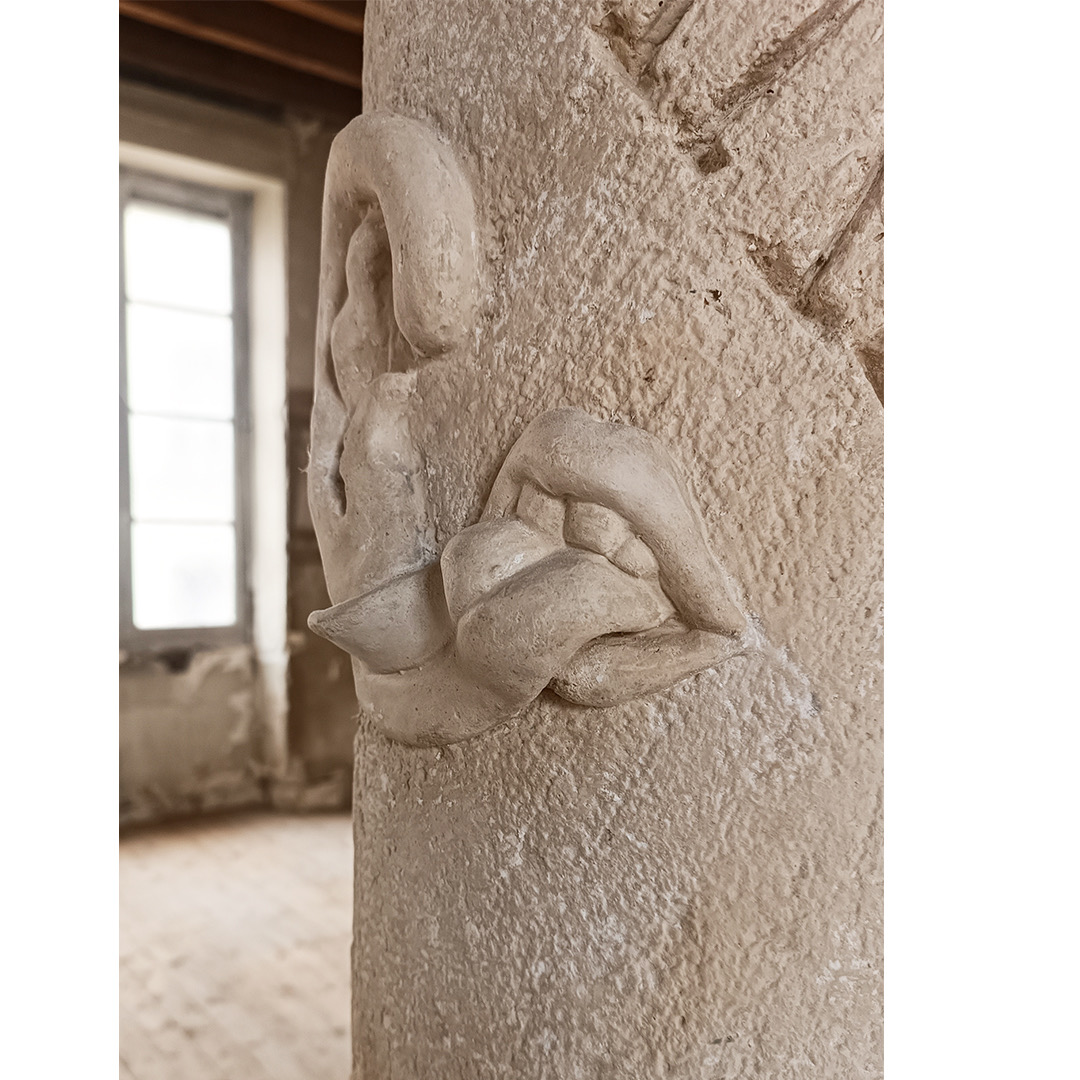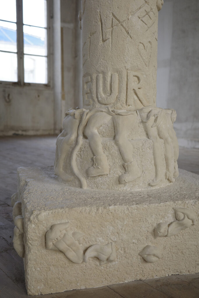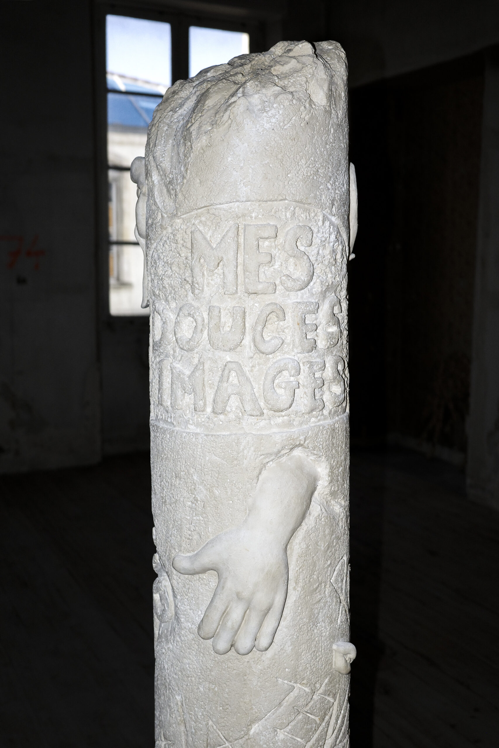À l’image de ces décombres au faste flétri desquels émerge la colonne, la réalisation de l’œuvre nécessite la technique du moule perdu : il faut détruire le moule au marteau et au burin pour libérer le tirage* au risque de l’entamer. Ce phénomène de création destructrice renvoie au couple perte-survivance qu’induit la pensée romantique. Non sans ironie, la colonne se dégage toutefois de toute sensiblerie par son titre grivois : Brisée et baisers. Cette mise à distance railleuse dévoile la supercherie qu’est le décor.