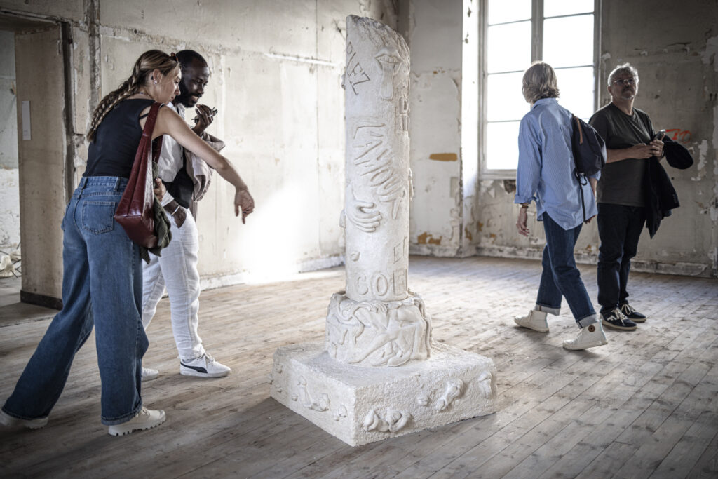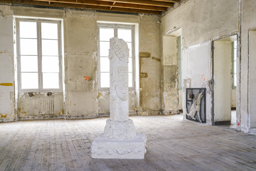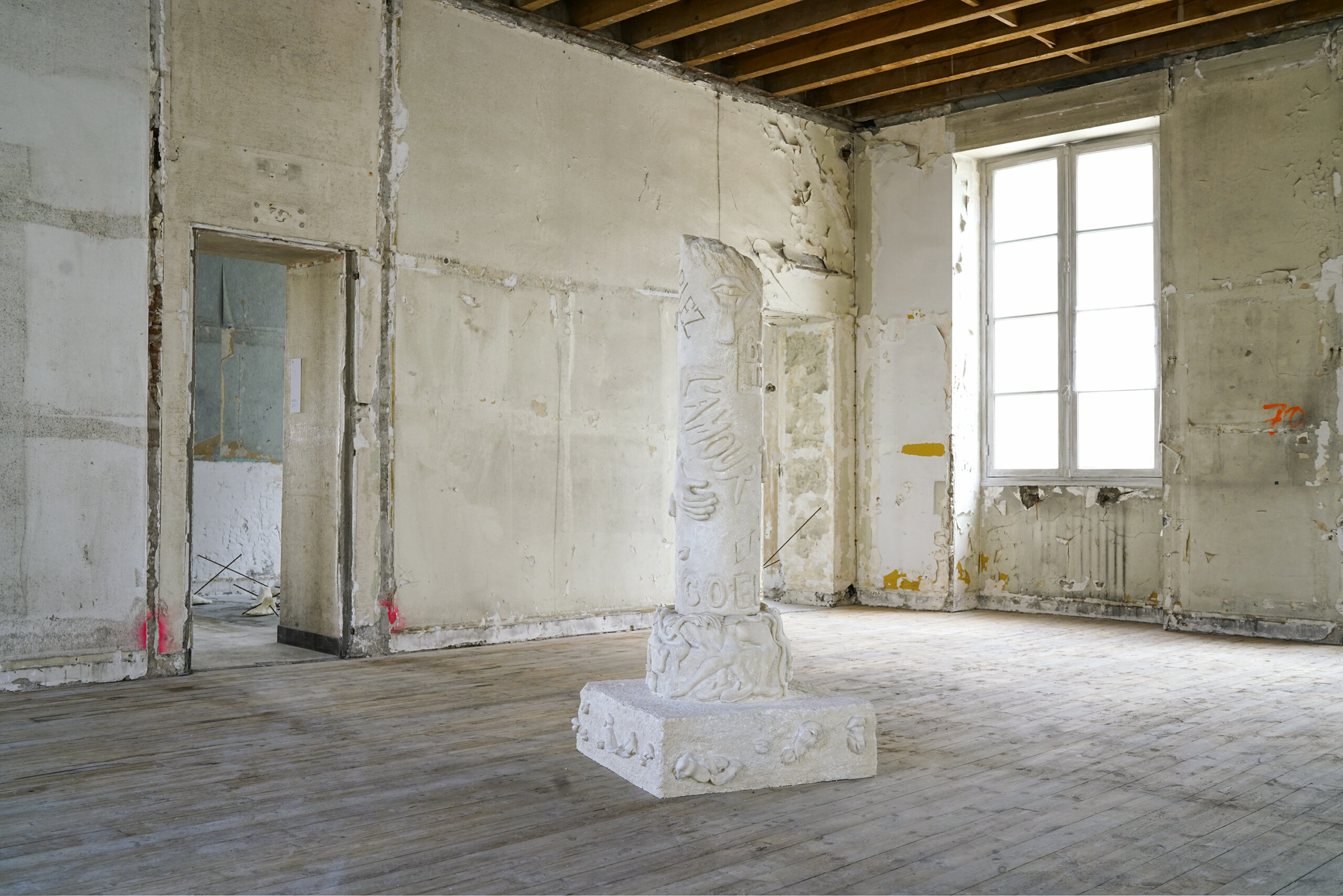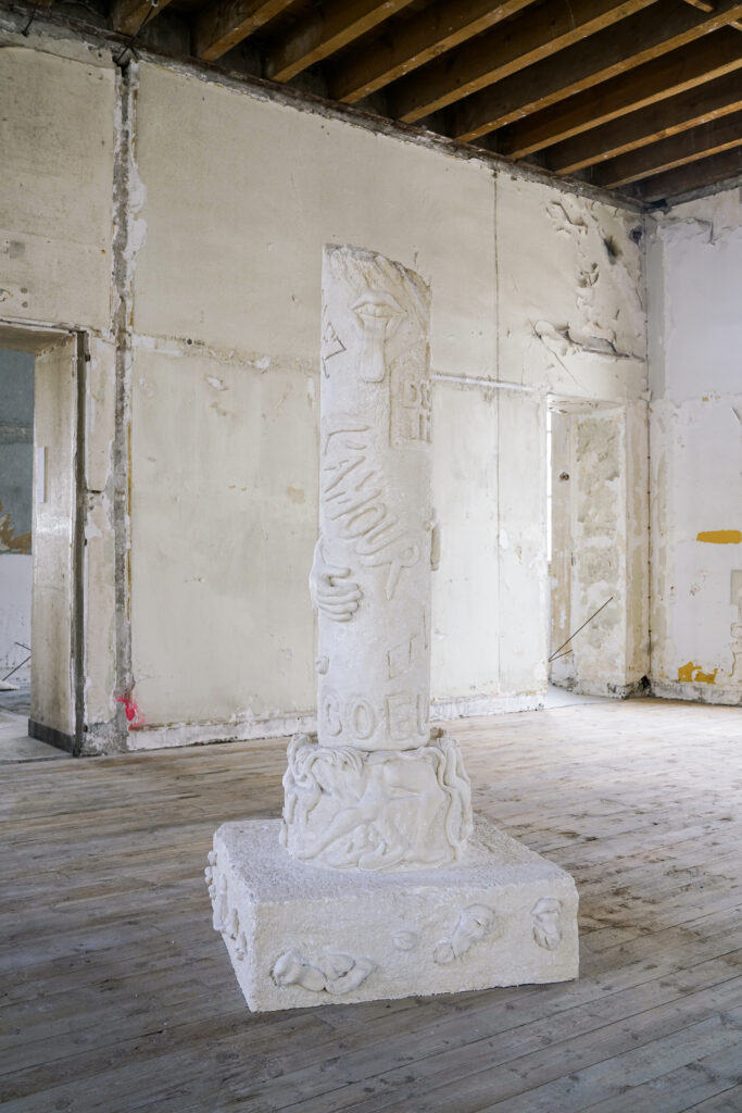 À l’image de ces décombres au faste flétri desquels émerge la colonne, la réalisation de l’œuvre nécessite la technique du moule perdu : il faut détruire le moule au marteau et au burin pour libérer le tirage* au risque de l’entamer. Ce phénomène de création destructrice renvoie au couple perte-survivance qu’induit la pensée romantique. Non sans ironie, la colonne se dégage toutefois de toute sensiblerie par son titre grivois : Brisée et baisers. Cette mise à distance railleuse dévoile la supercherie qu’est le décor.