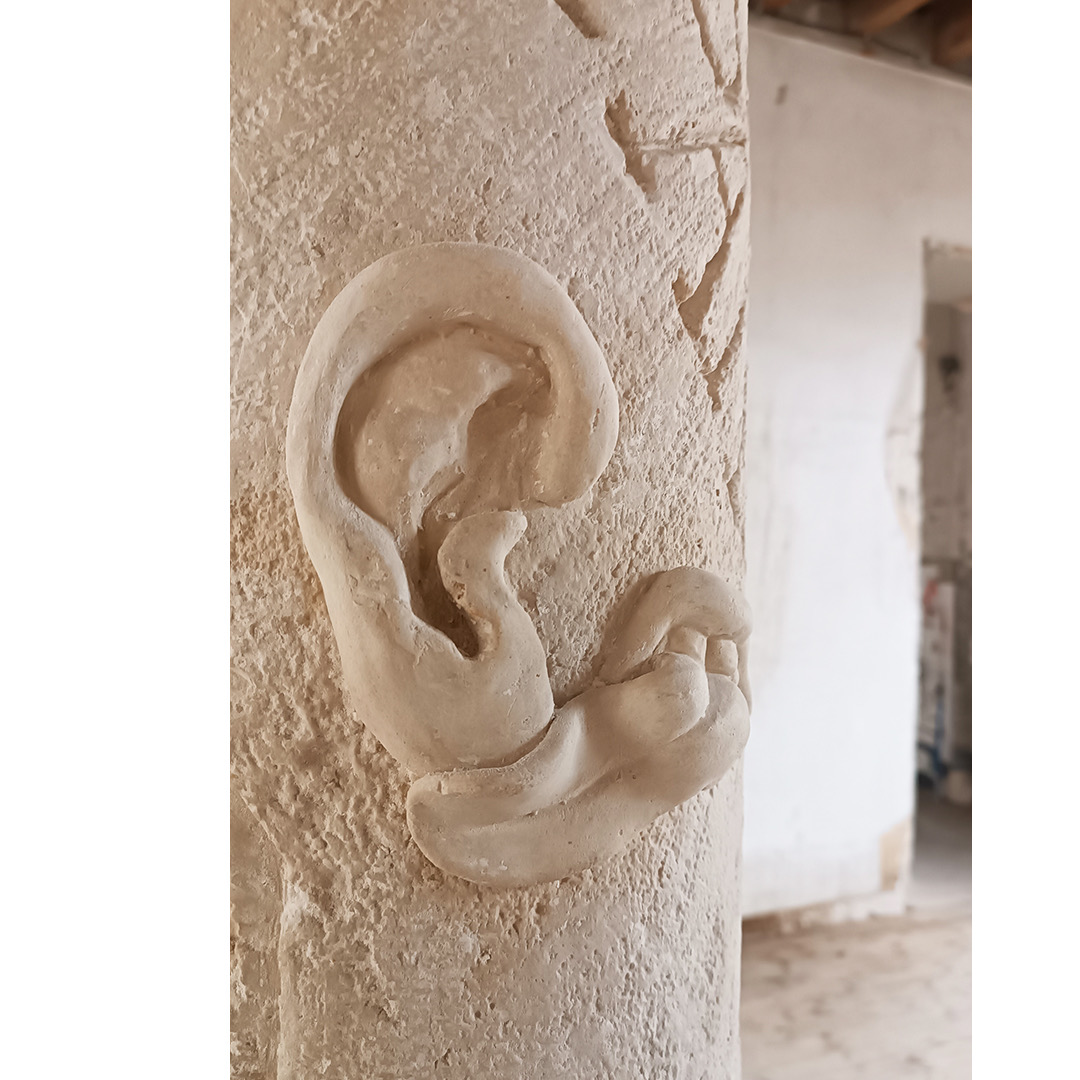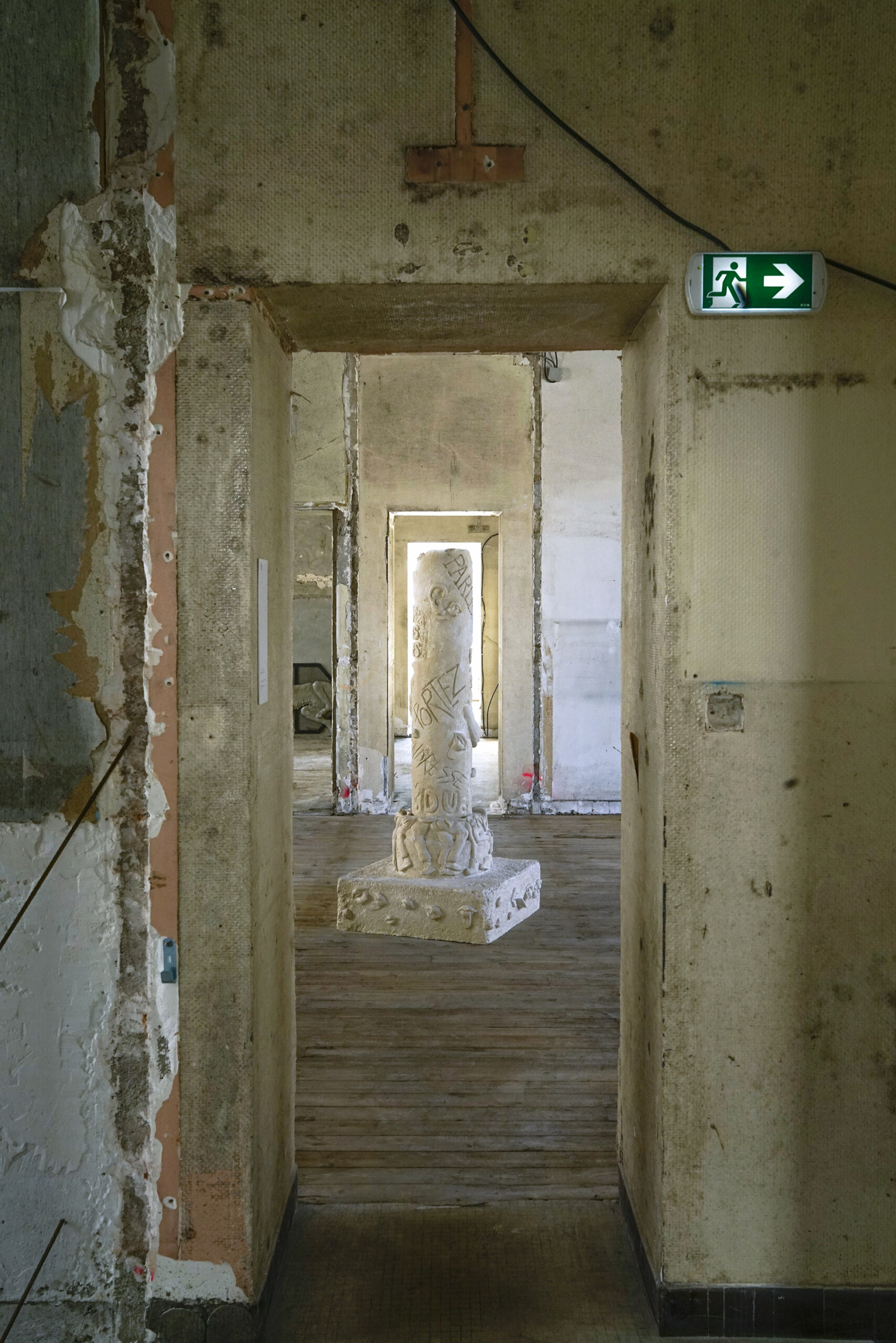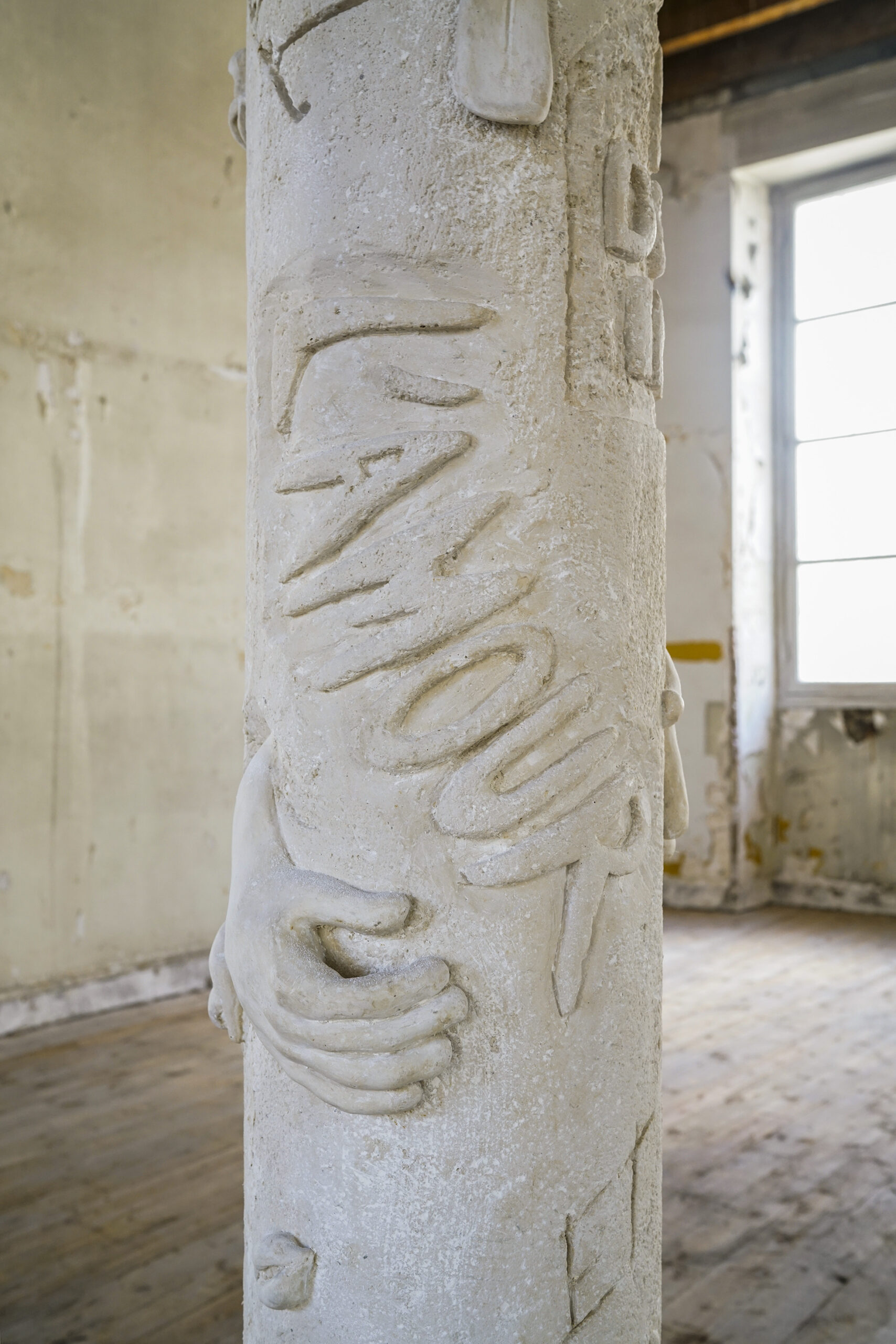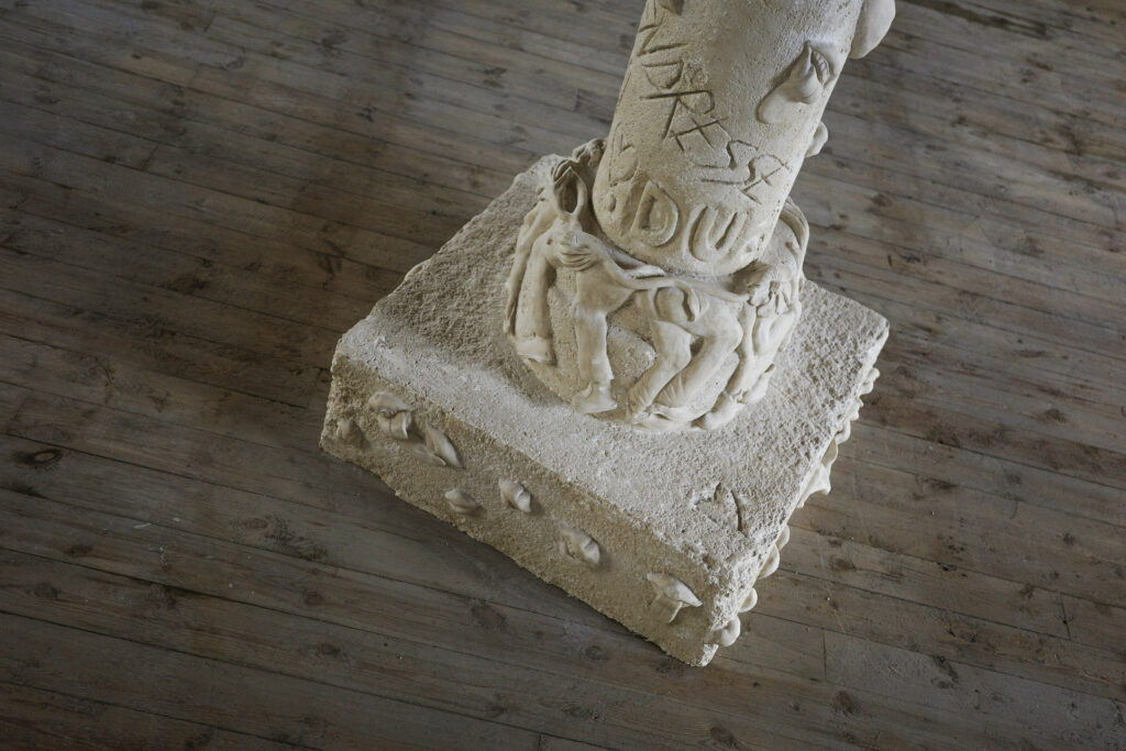Les textures et les matières ne sont pas ce qu’elles paraissent : la colonne n’est pas sculptée dans la roche mais taillée dans du polystyrène puis moulée dans un amalgame de résine et de poudre de pierre. À s’y méprendre (…)