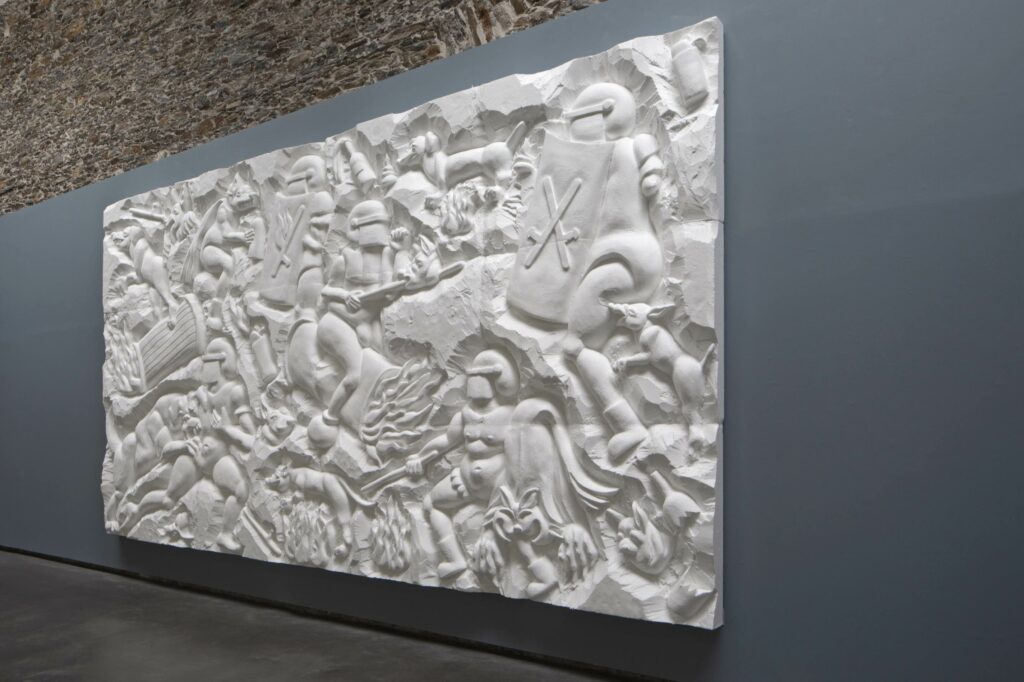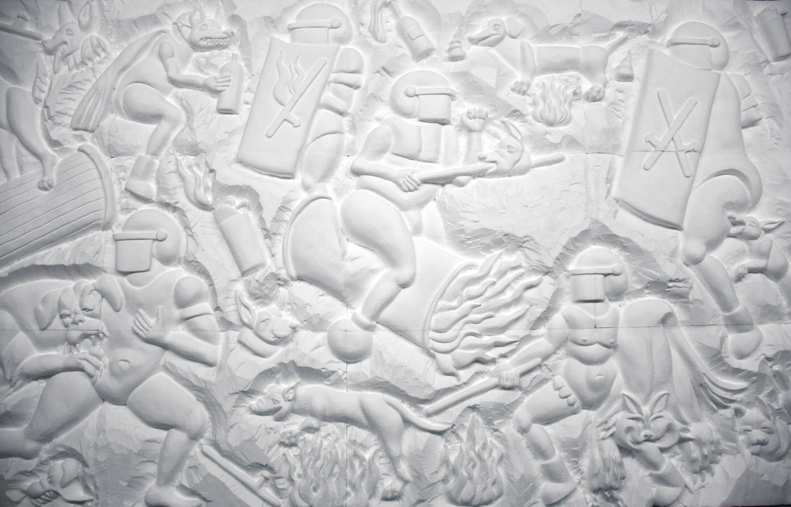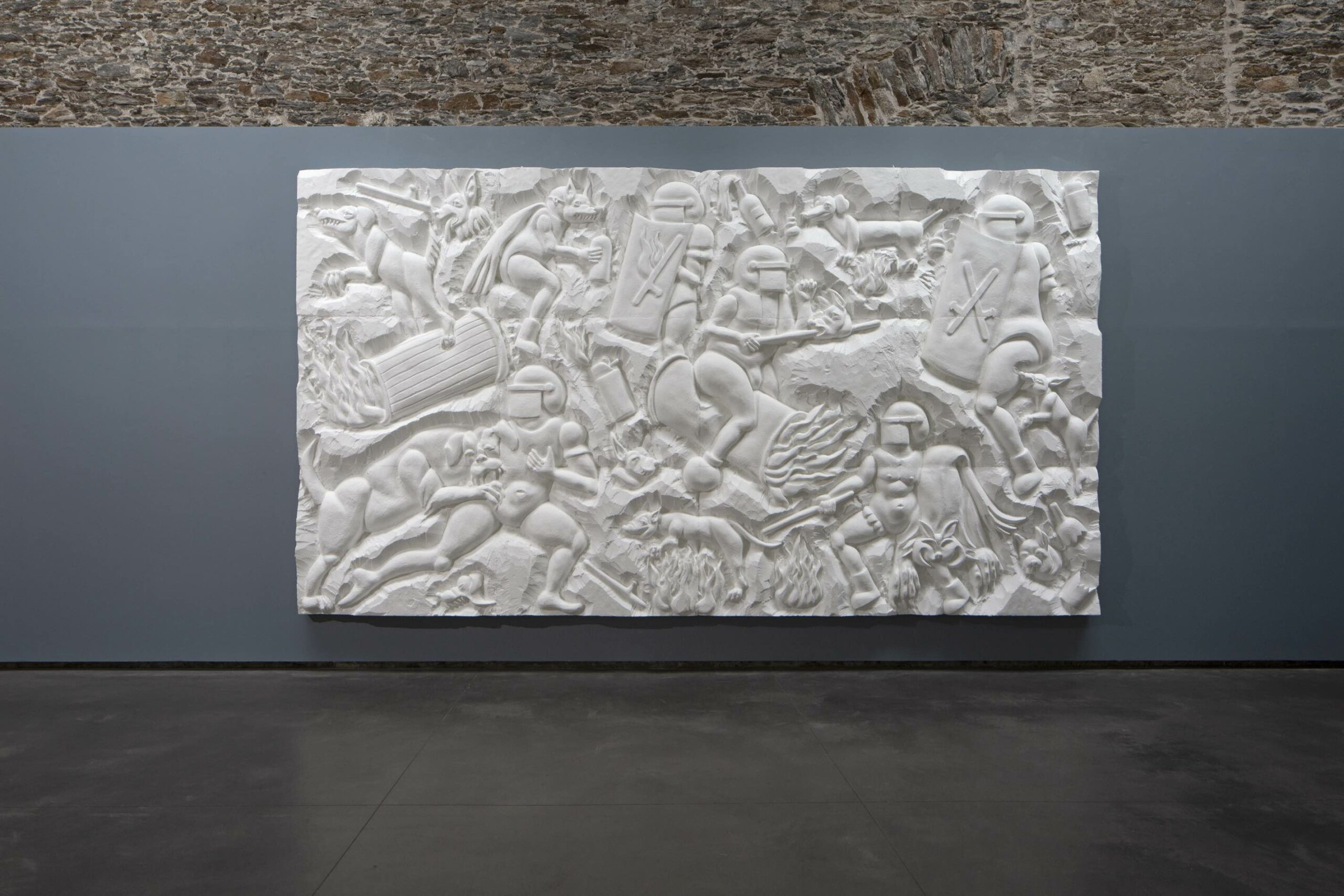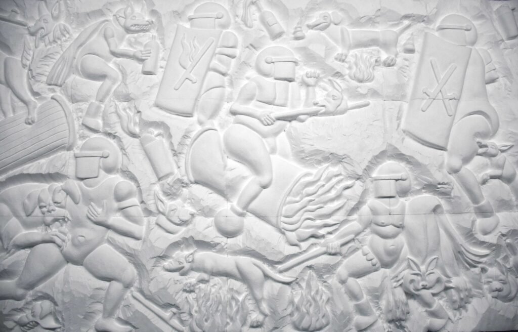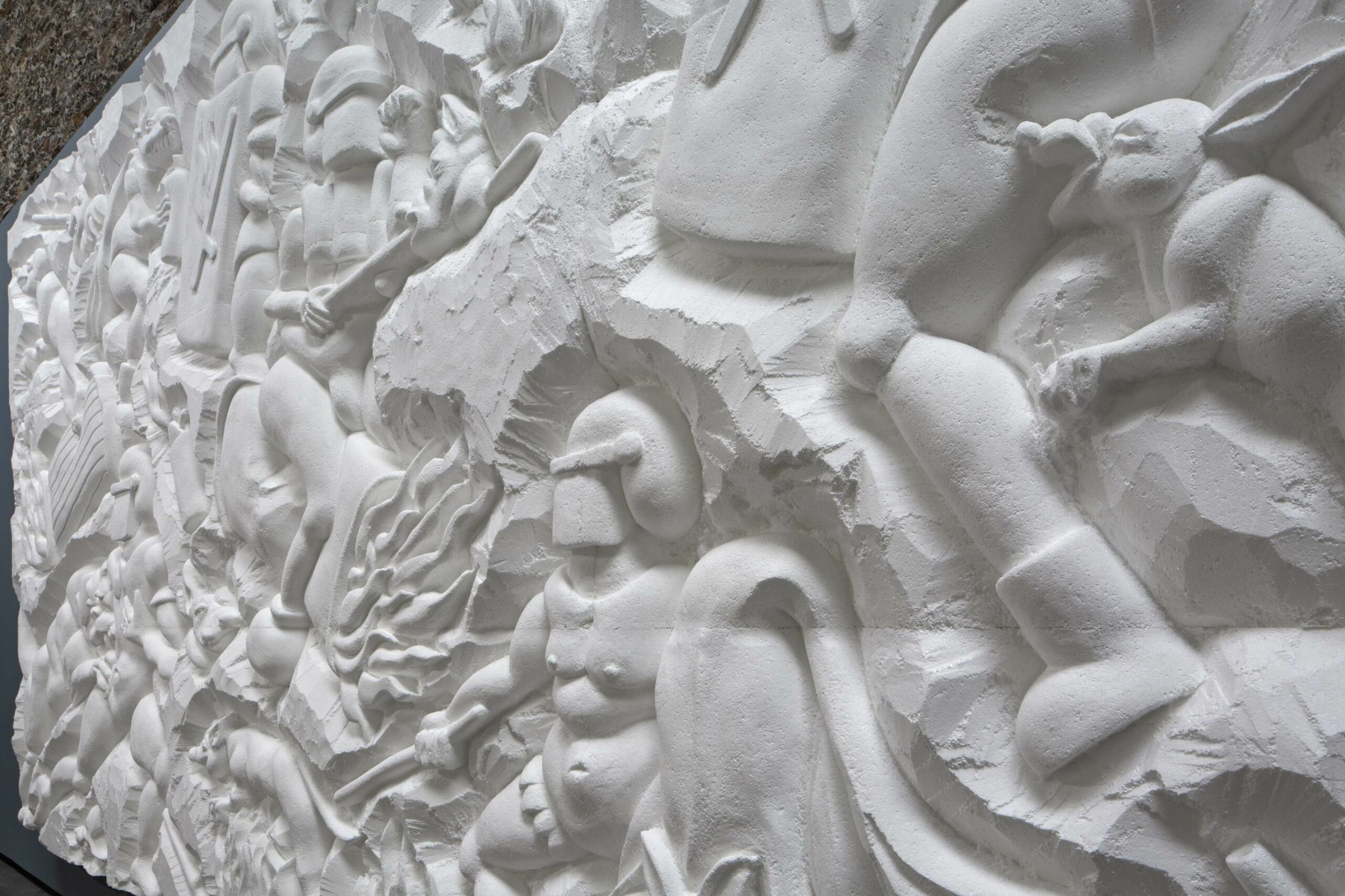 « L’histoire de la représentation, qu’elle soit politique ou religieuse, regorge du recours aux scènes historiées monumentales pour célébrer les puissants ou diffuser les récits fondateurs auprès des peuples. « Martyre decorum » reprend à son compte l’esthétique des parements en bas relief qui, depuis l’Antiquité et jusqu’à l’époque contemporaine, ont glorifié les batailles (des puissants) et les luttes (des opprimés). L’artiste opère cependant une bascule, évoquant les violences des forces de l’ordre dans une scène qui vire à l’émeute.