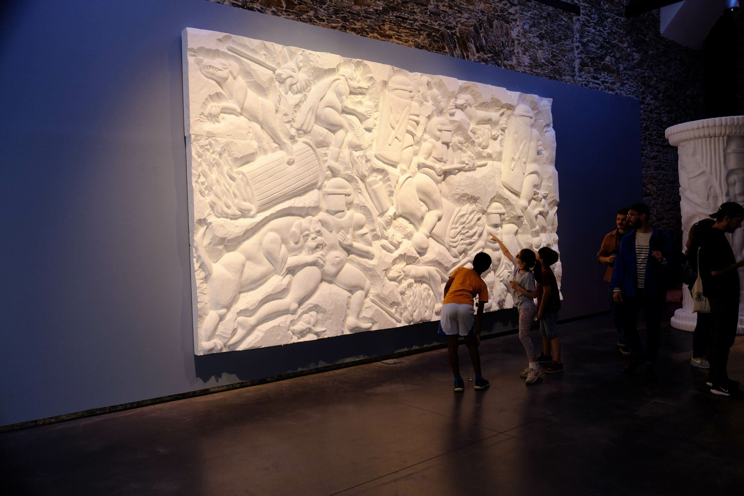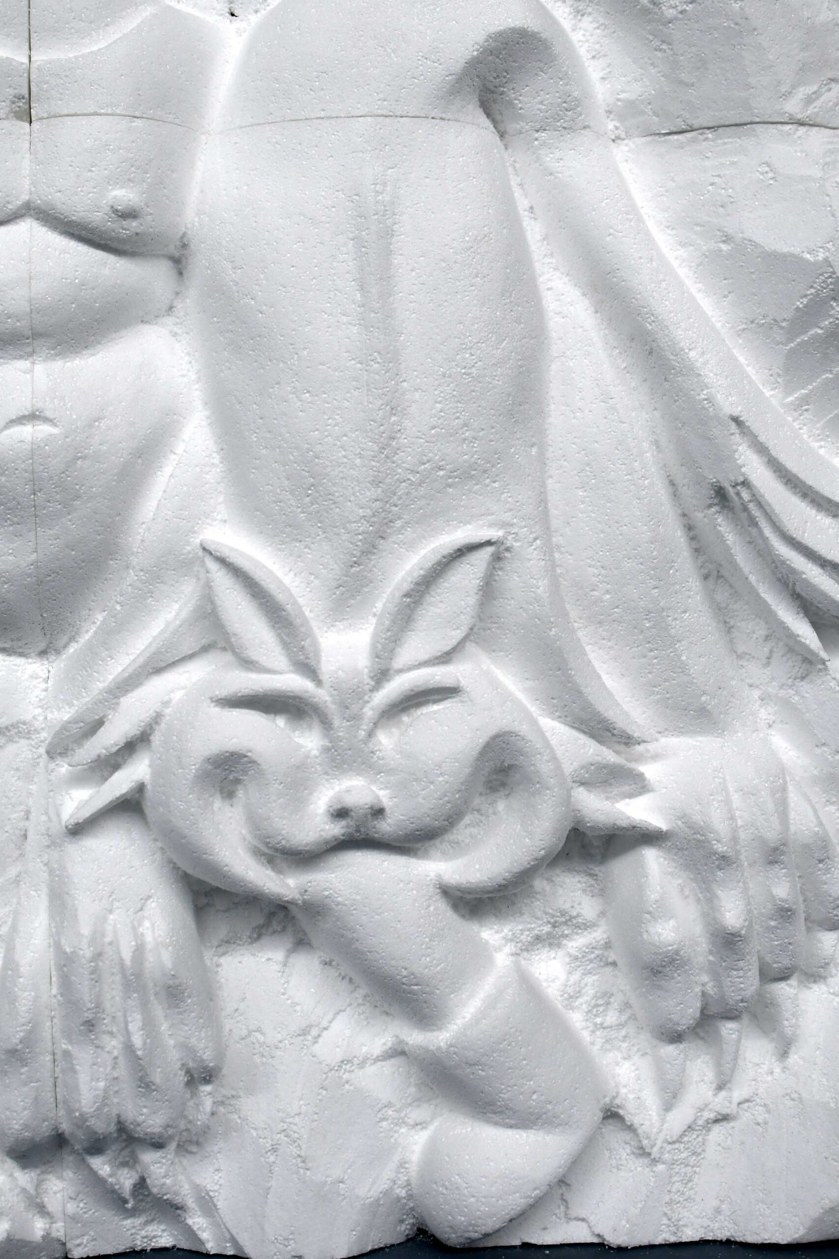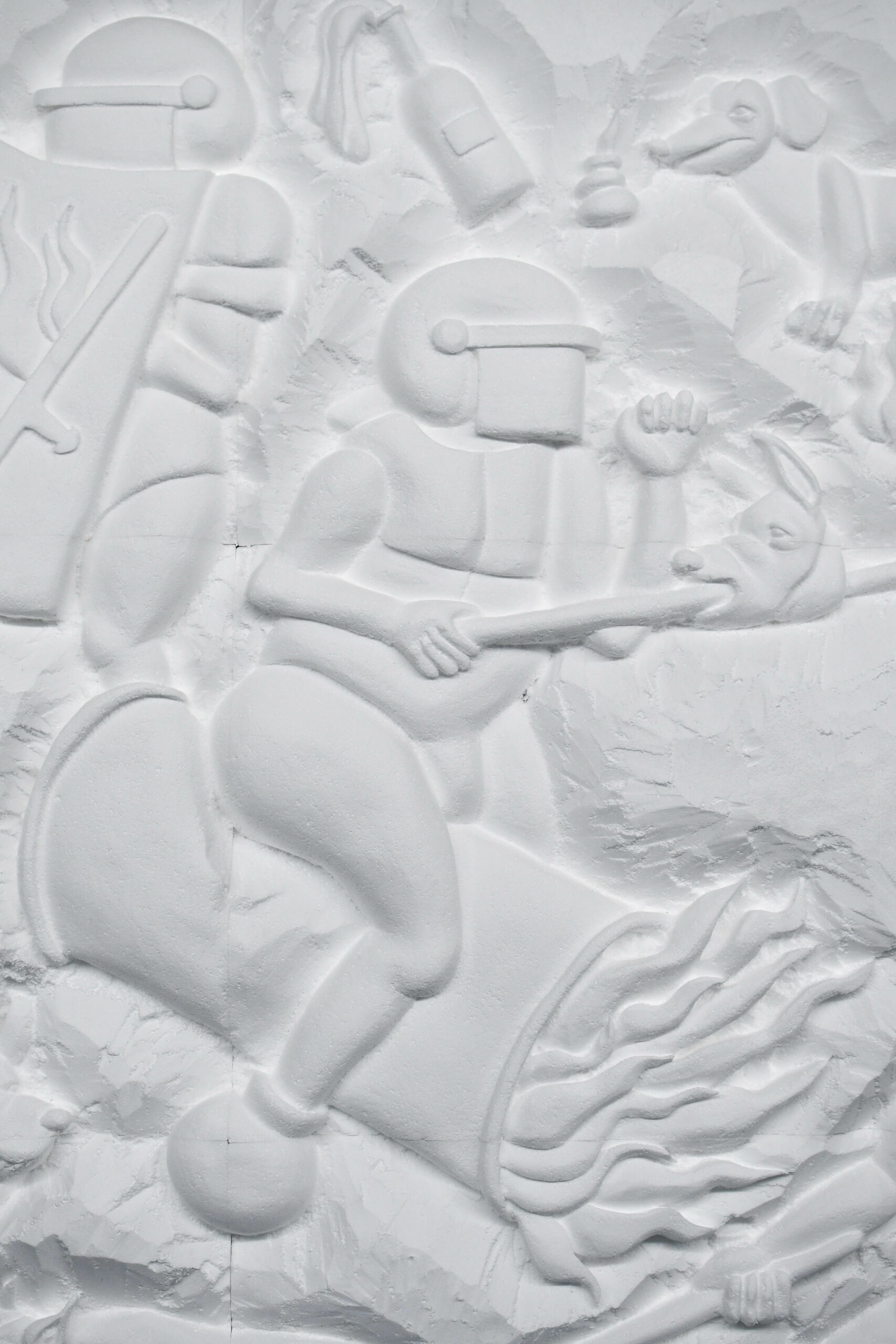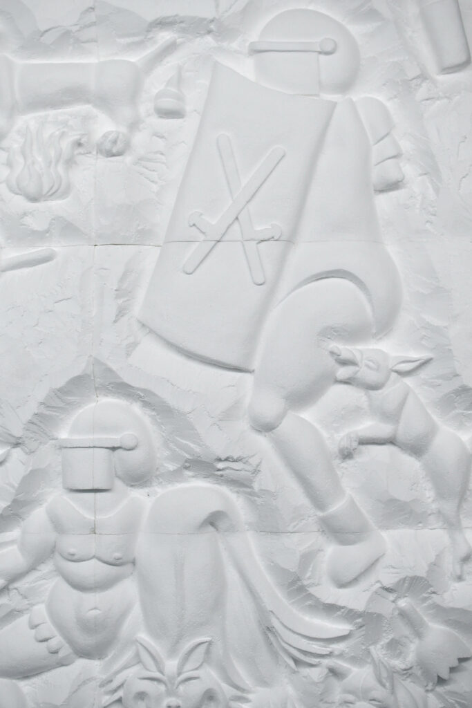 « L’histoire de la représentation, qu’elle soit politique ou religieuse, regorge du recours aux scènes historiées monumentales pour célébrer les puissants ou diffuser les récits fondateurs auprès des peuples. « Martyre decorum » reprend à son compte l’esthétique des parements en bas relief qui, depuis l’Antiquité et jusqu’à l’époque contemporaine, ont glorifié les batailles (des puissants) et les luttes (des opprimés). L’artiste opère cependant une bascule, évoquant les violences des forces de l’ordre dans une scène qui vire à l’émeute.