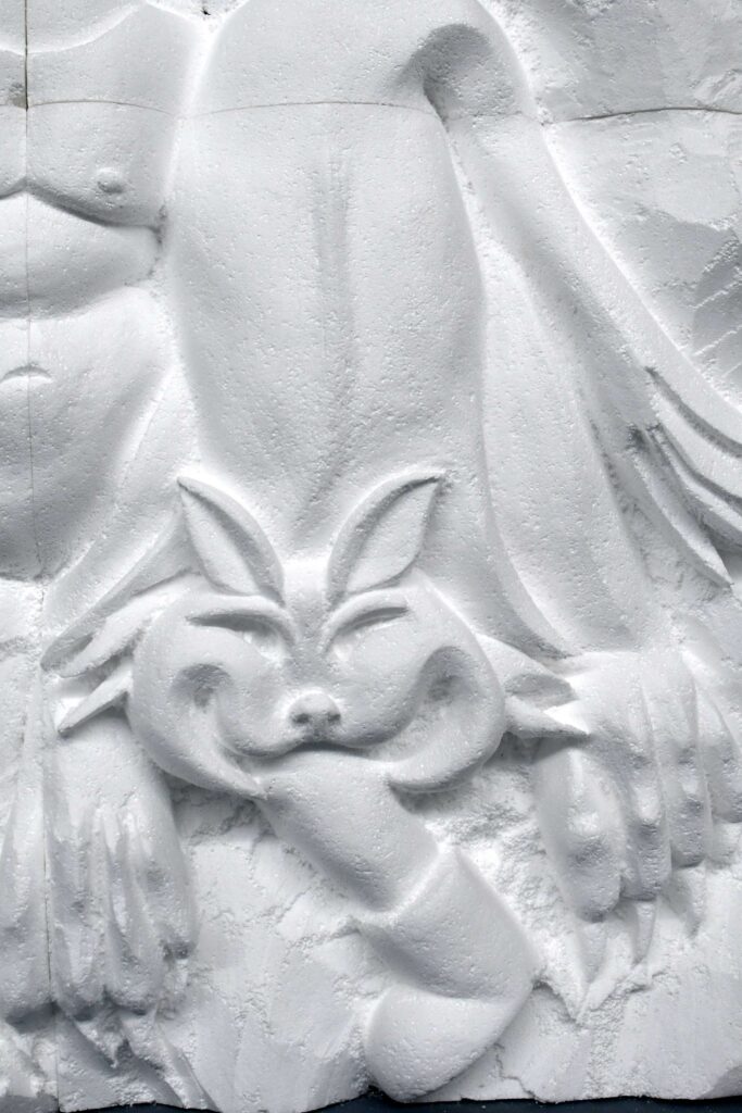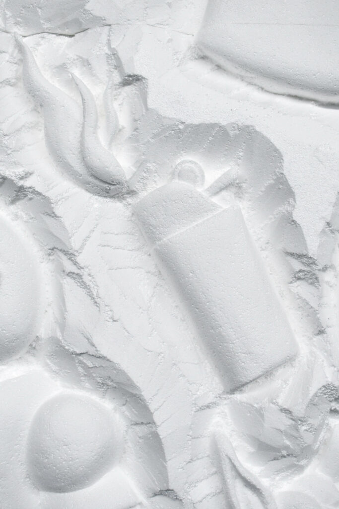 L’emploi du polystyrène souligne, quant à lui, la fragilité du contrat social et des formes de pouvoir. C’est également un matériau issu de la pétrochimie dont l’usage détonne à l’époque des préoccupations écologiques. Il agit là d’une sorte de redondance cathartique : exposer des faits condamnables au travers d’un support tout aussi réprouvé. » – Extrait de texte – Hélène Dantic – 2025